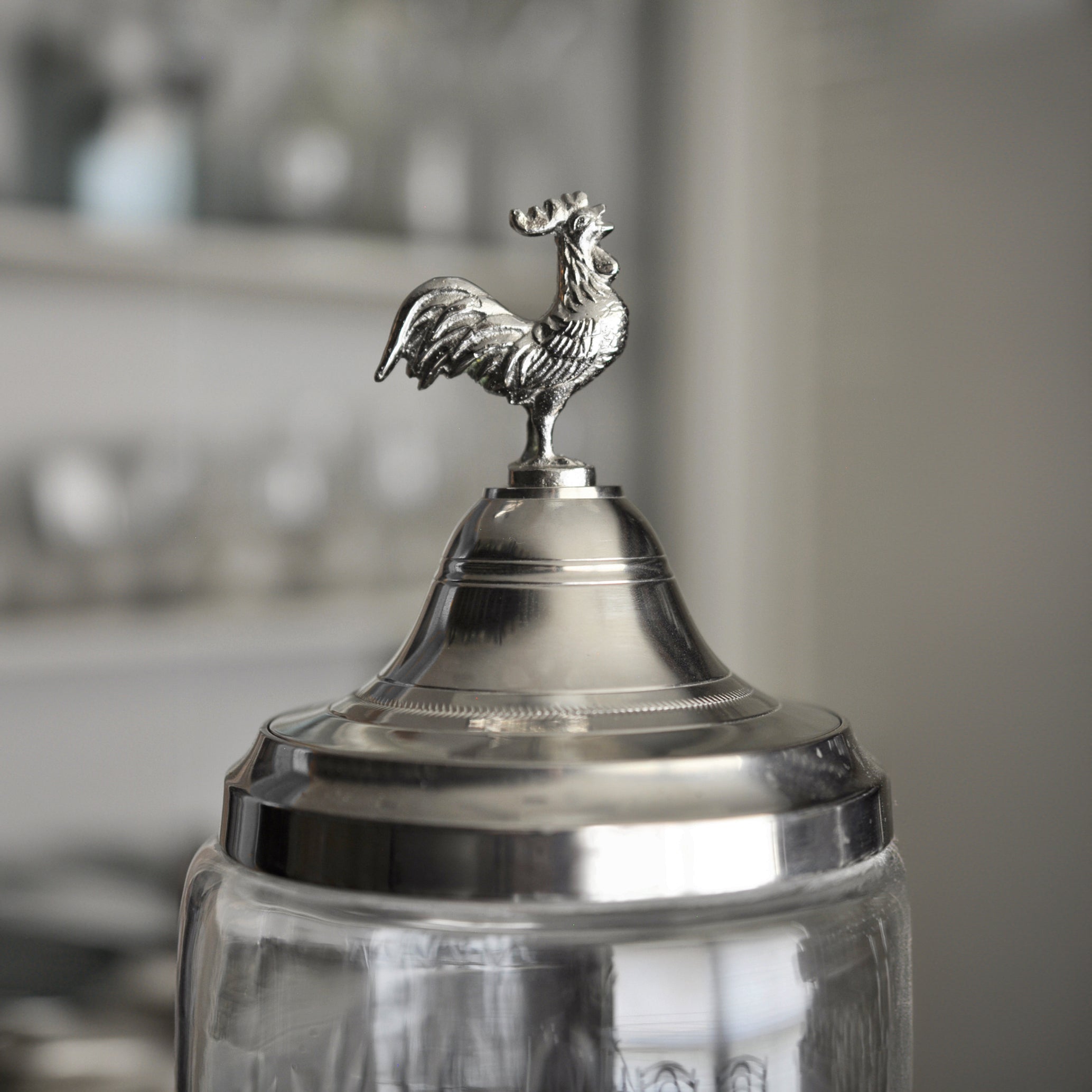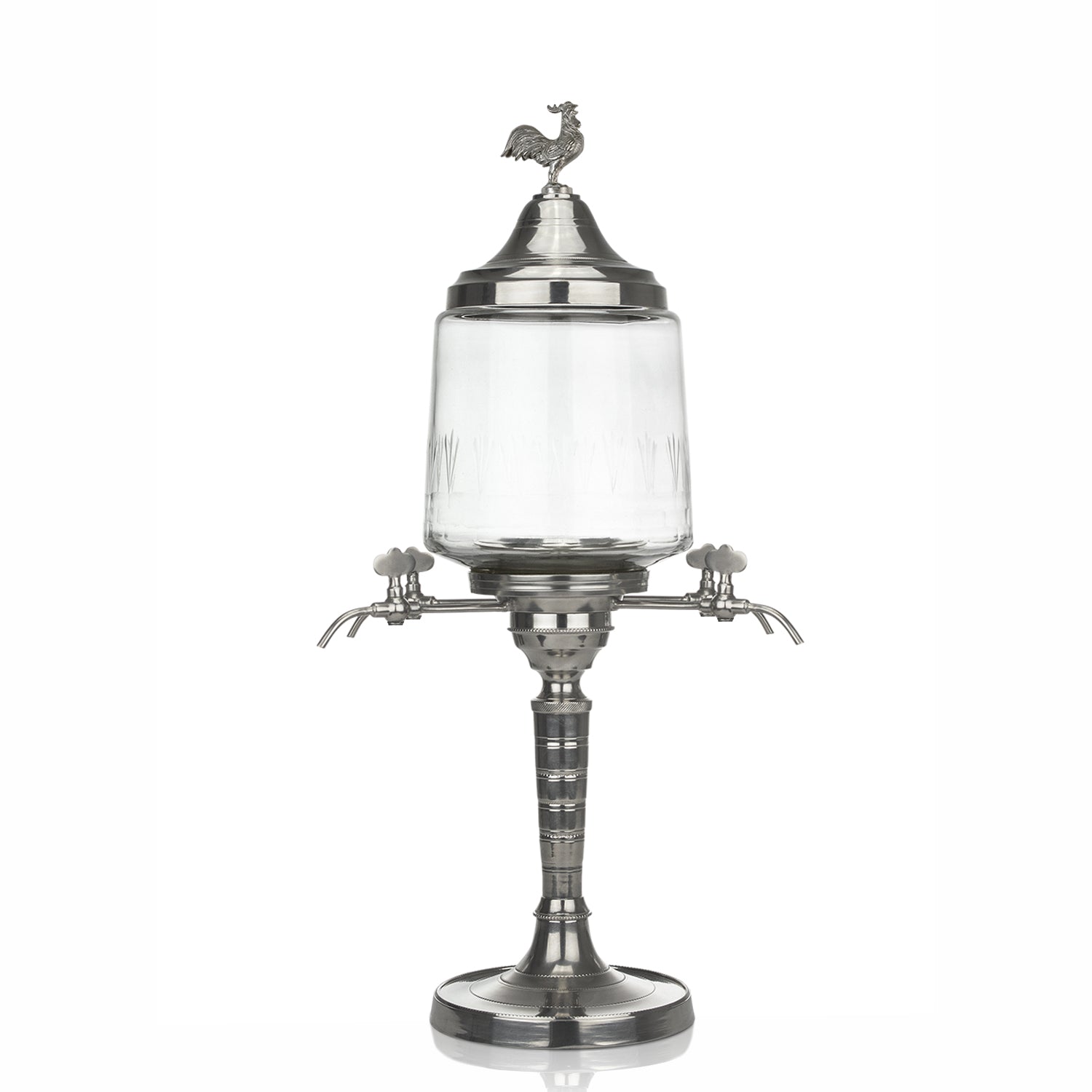 This four-spout fountain is a reproduction of a rare late vintage 19th-century Belle Époque absinthe fountain. It is also the most popular absinthe fountain sold in France. The lid features a rooster (France's national symbol), best known for adorning the rare antique absinthe fountains used to promote Absinthe Terminus (a popular 19th-century French absinthe). The lid is removable to add ice water to the glass bowl, which includes an ice filter. The glass bowl is mouth-blown, and the fountain is handmade.