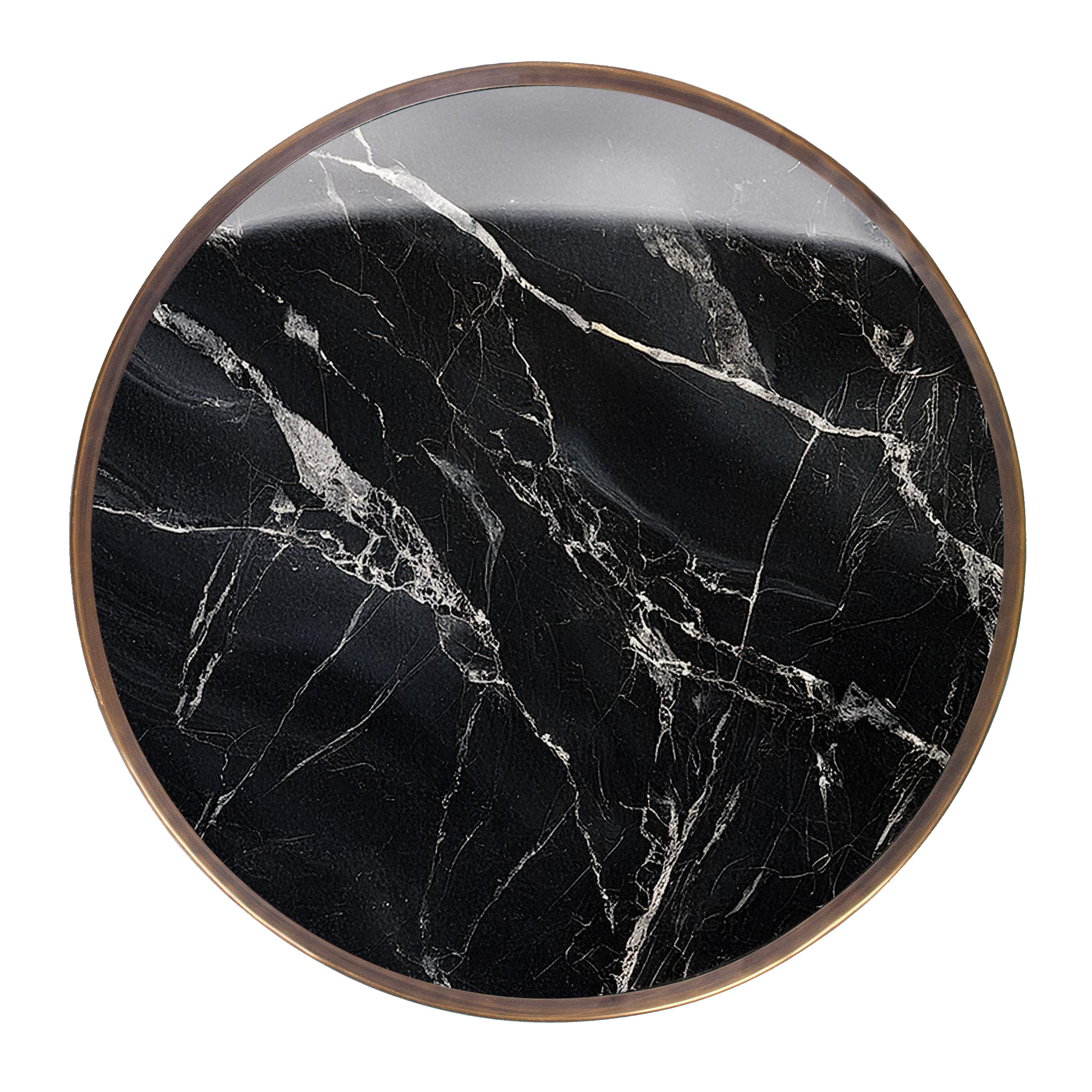 The brass rim has an antiqued, seamless brass band encompassing the stone's rim. The base features the same detail from an early 20th-century French bistro table. We replicated the construction process, including how the marble is affixed to the table.