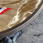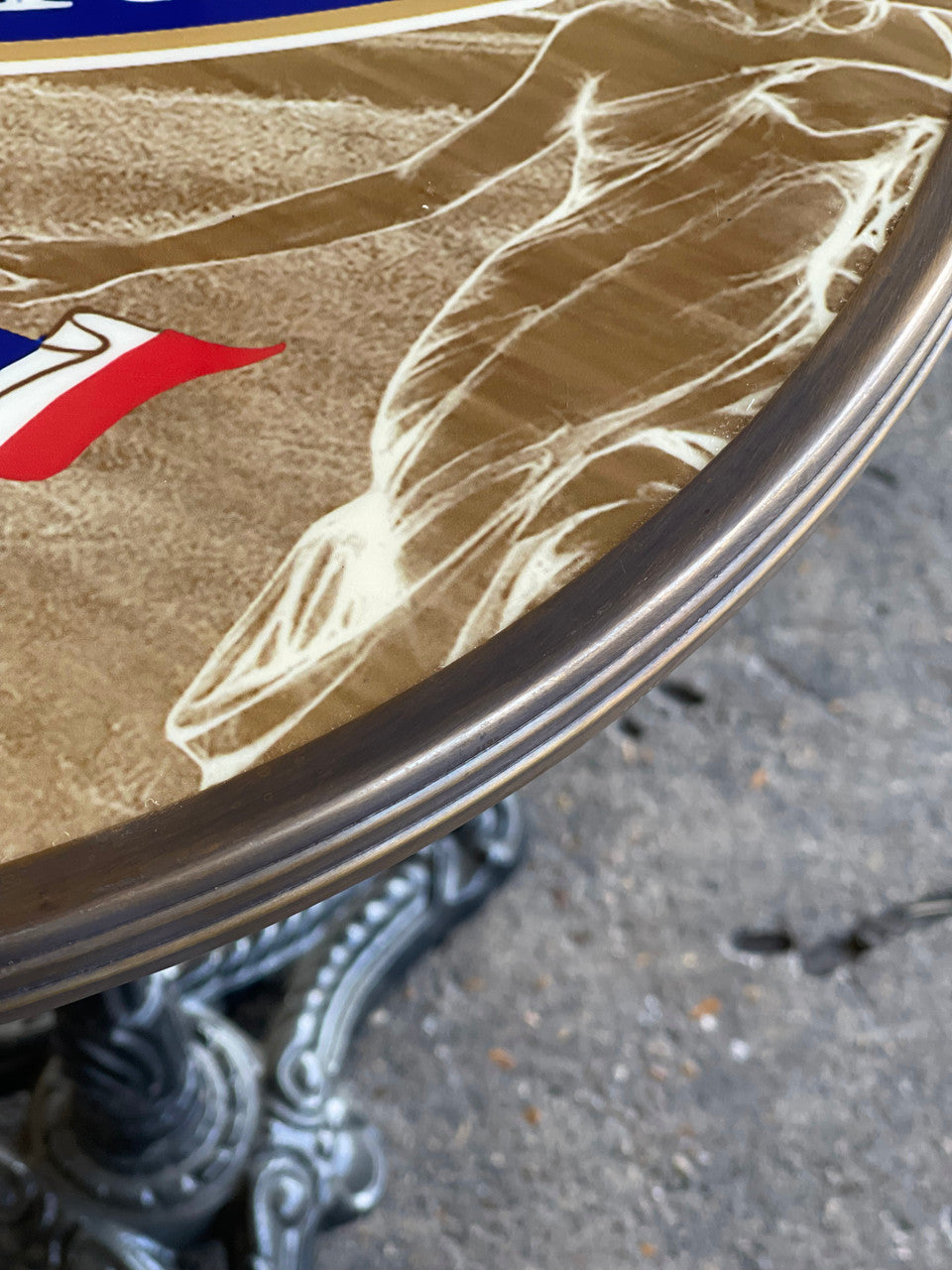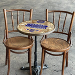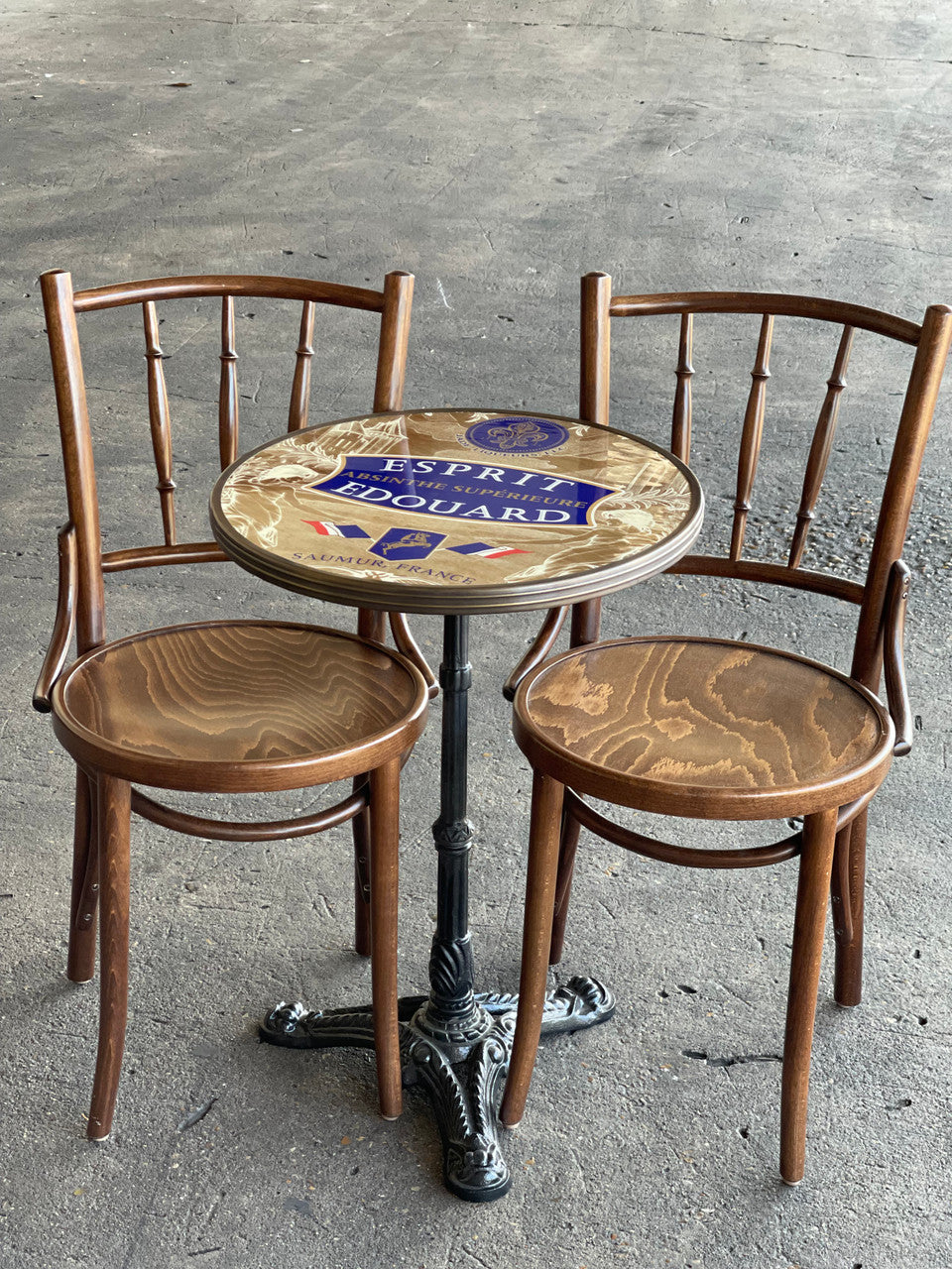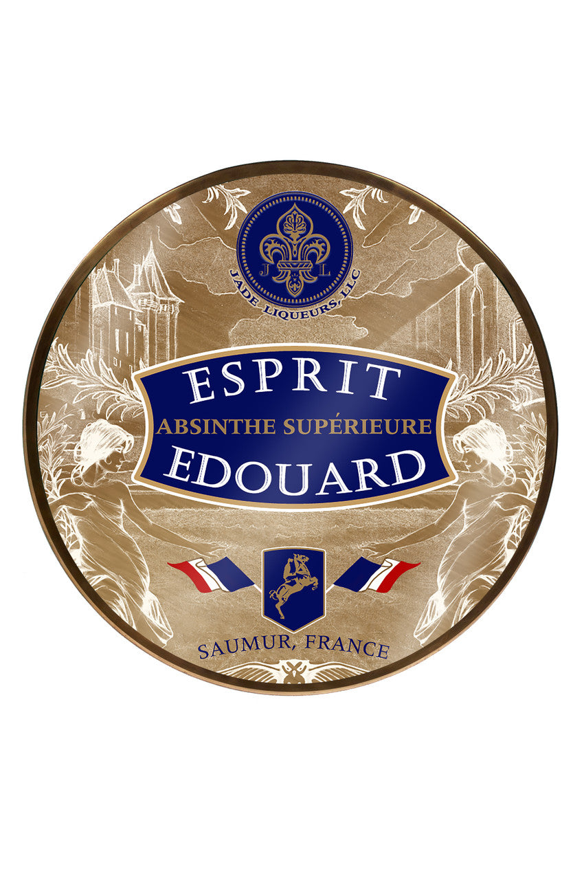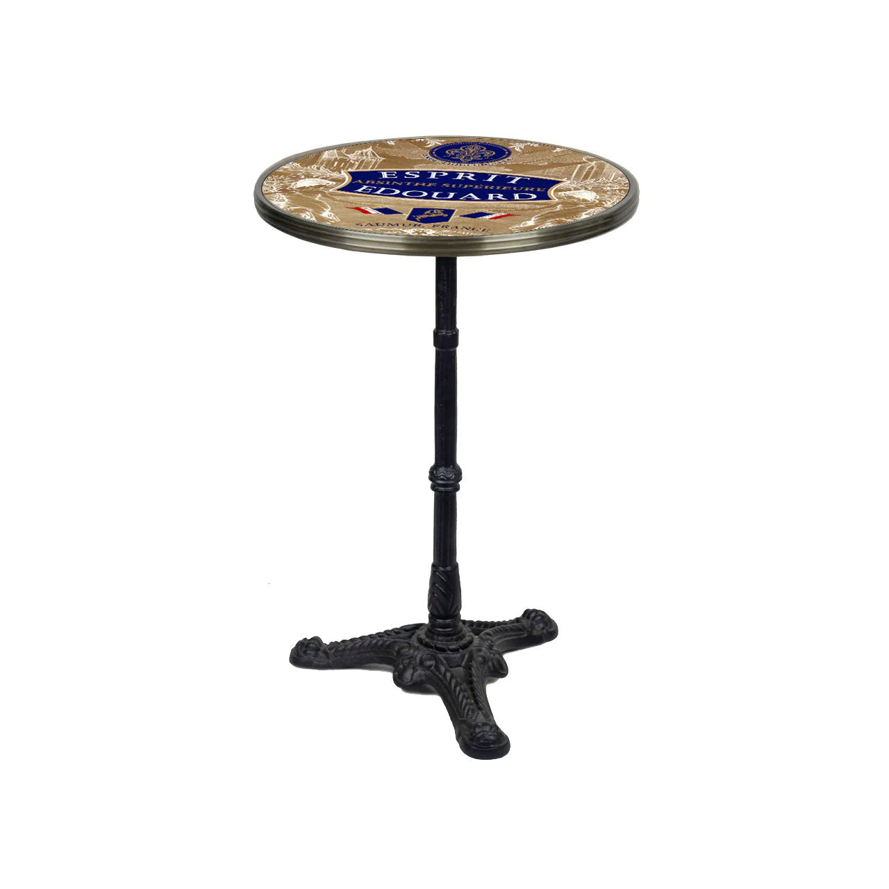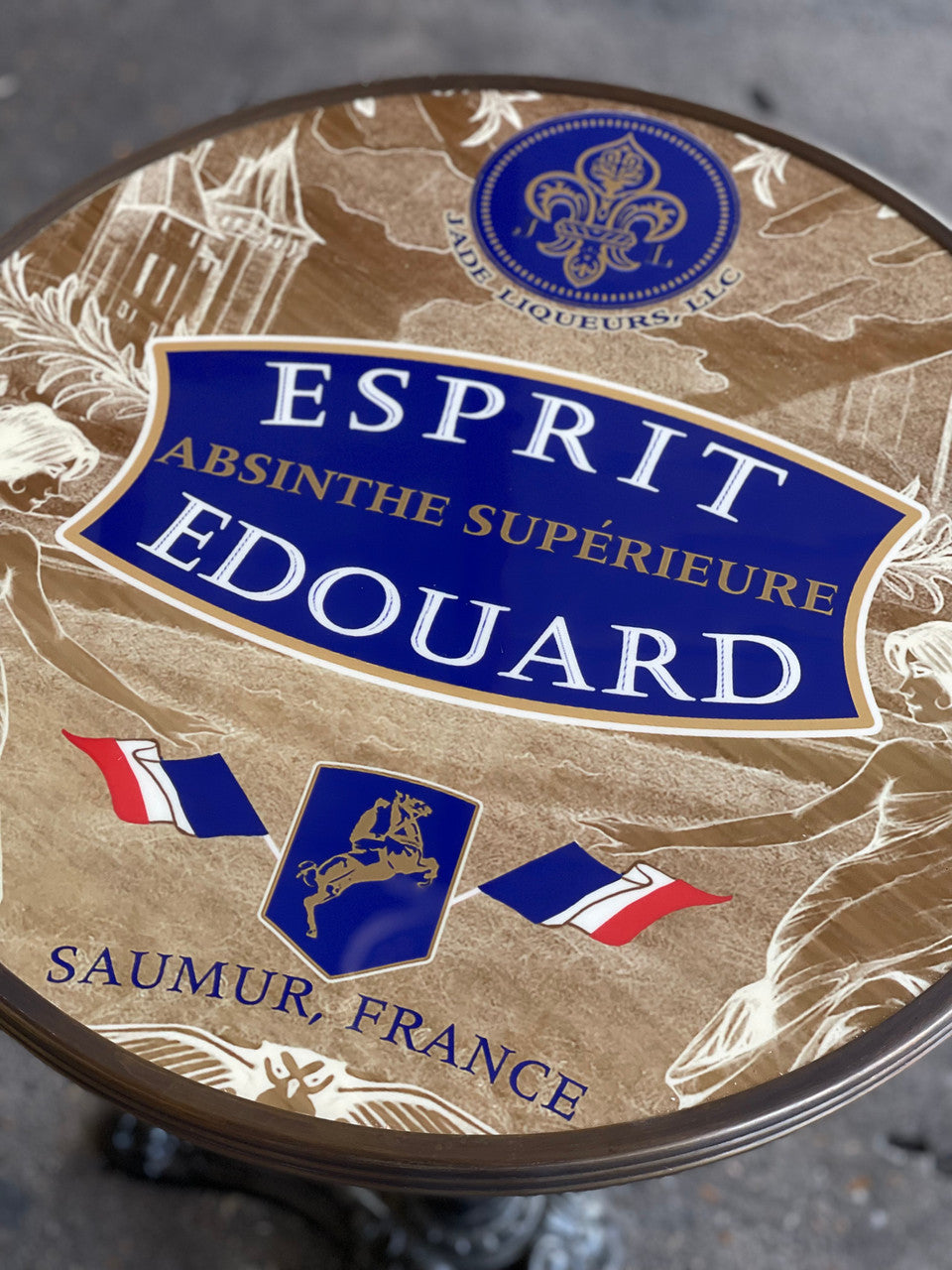 This beautiful bistro table features the absinthe brand, Esprit Edouard, by Jade Liqueurs. Jade Liqueurs is regarded as one of the most respected and historically accurate makers of pre-ban absinthe (before 1915) on the world market. Esprit Edouard is considered one of its top brands.