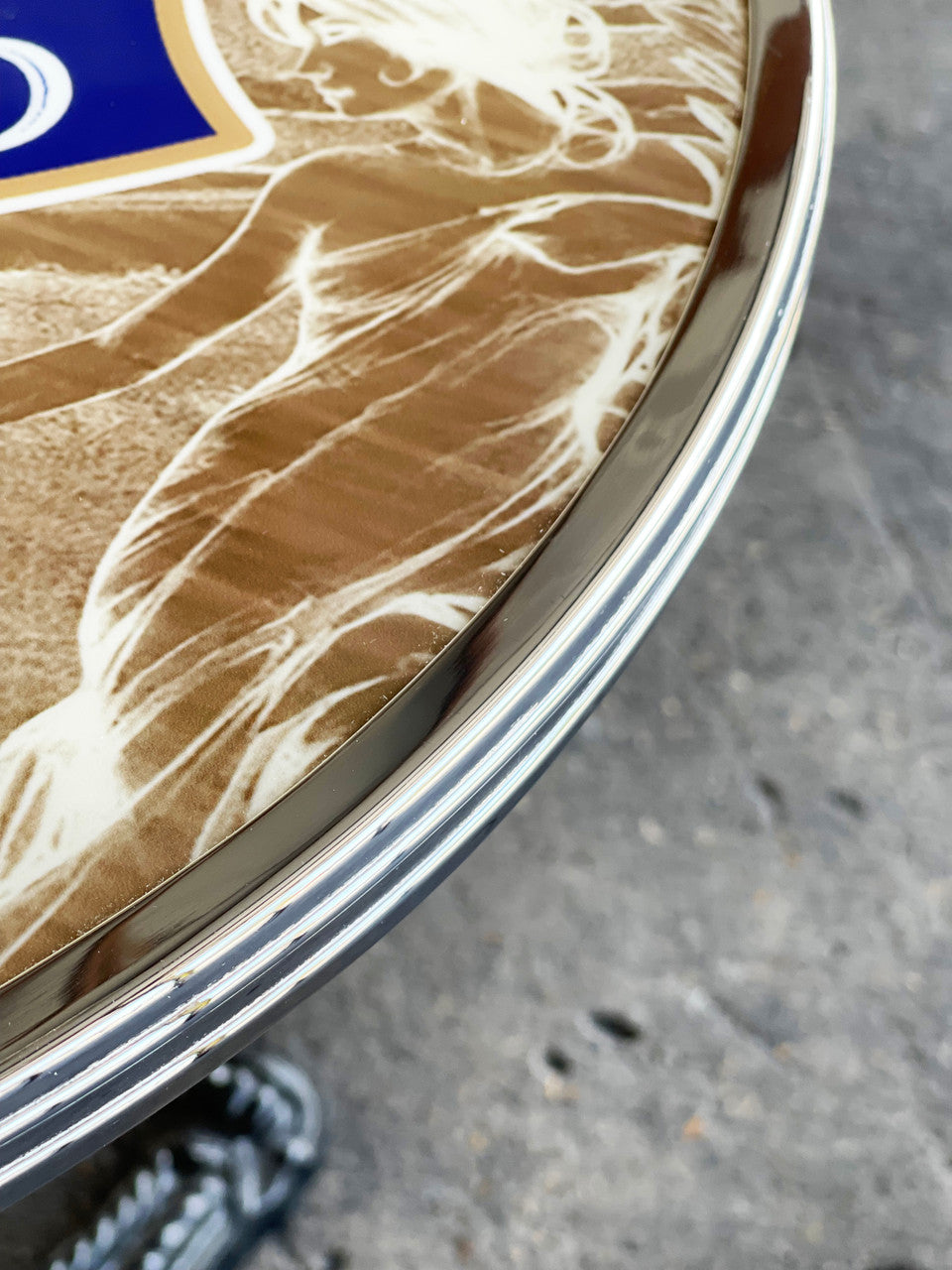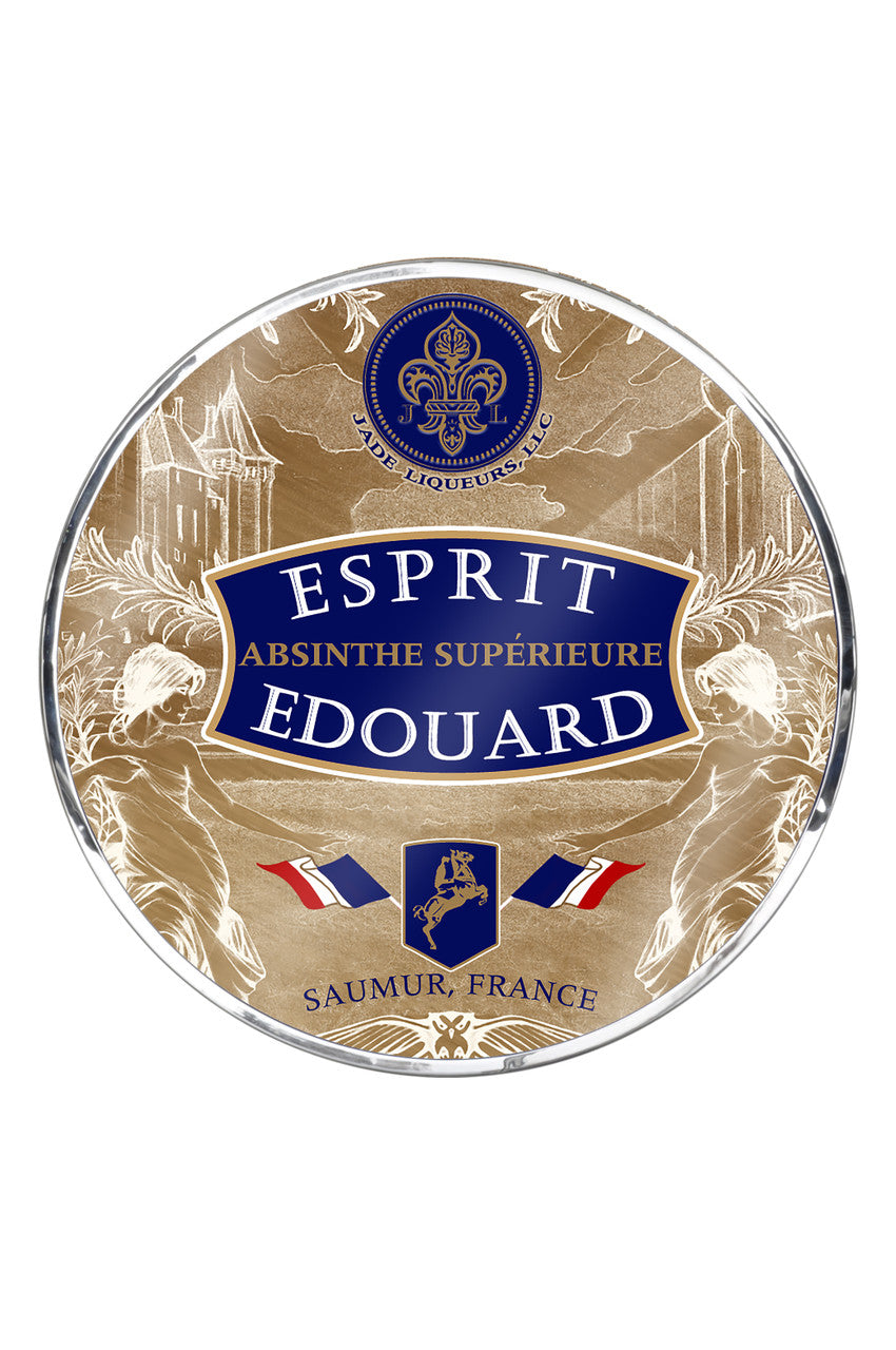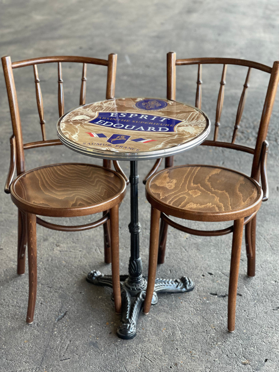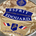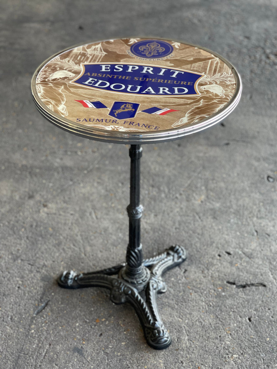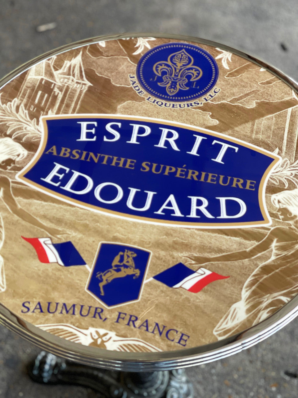 This beautiful bistro table features the absinthe brand, Esprit Edouard, by Jade Liqueurs. Jade Liqueurs is regarded as one of the most respected and historically accurate makers of pre-ban absinthe (before 1915) on the world market. Esprit Edouard is considered one of its top brands.