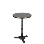 Each table features an antiqued, seamless brass band which encompasses the rim of the granite. The cast iron, three legged base features the same detail taken from an original early 20th century French bistro table. All construction has been faithfully reproduced, including the way the granite is a fixed to the table. It features 3 heavy duty steel prongs used under the table top to hold the granite to the base. The cast iron base and stem are held together by a large screw underneath the base. Brass band has been tarnished to give an antiqued appearance.