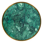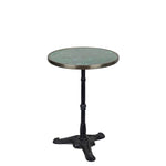 Each table features an antiqued, seamless brass band that encompasses the rim of the granite. The cast iron, three-legged base features the same detail as an original early 20th-century French bistro table. All construction has been faithfully reproduced, including how the granite is fixed to the table. It features 3 heavy-duty steel prongs used under the table top to hold the granite to the base. The cast iron base and stem are held together by a large screw underneath the base. The brass band has been tarnished to give it an antique appearance.