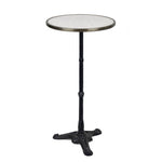These traditional tables feature a solid marble top inside a seamless brass banded rim and a sturdy, solid cast-iron base. The table's antiqued banded rim is made of brass and encircles the marble, protecting it from chipping and daily wear and tear. The base has been powder-coated and features the same detail from an early 20th-century French bistro table. We have replicated every part of the fabrication process, including how the marble is affixed to the table.