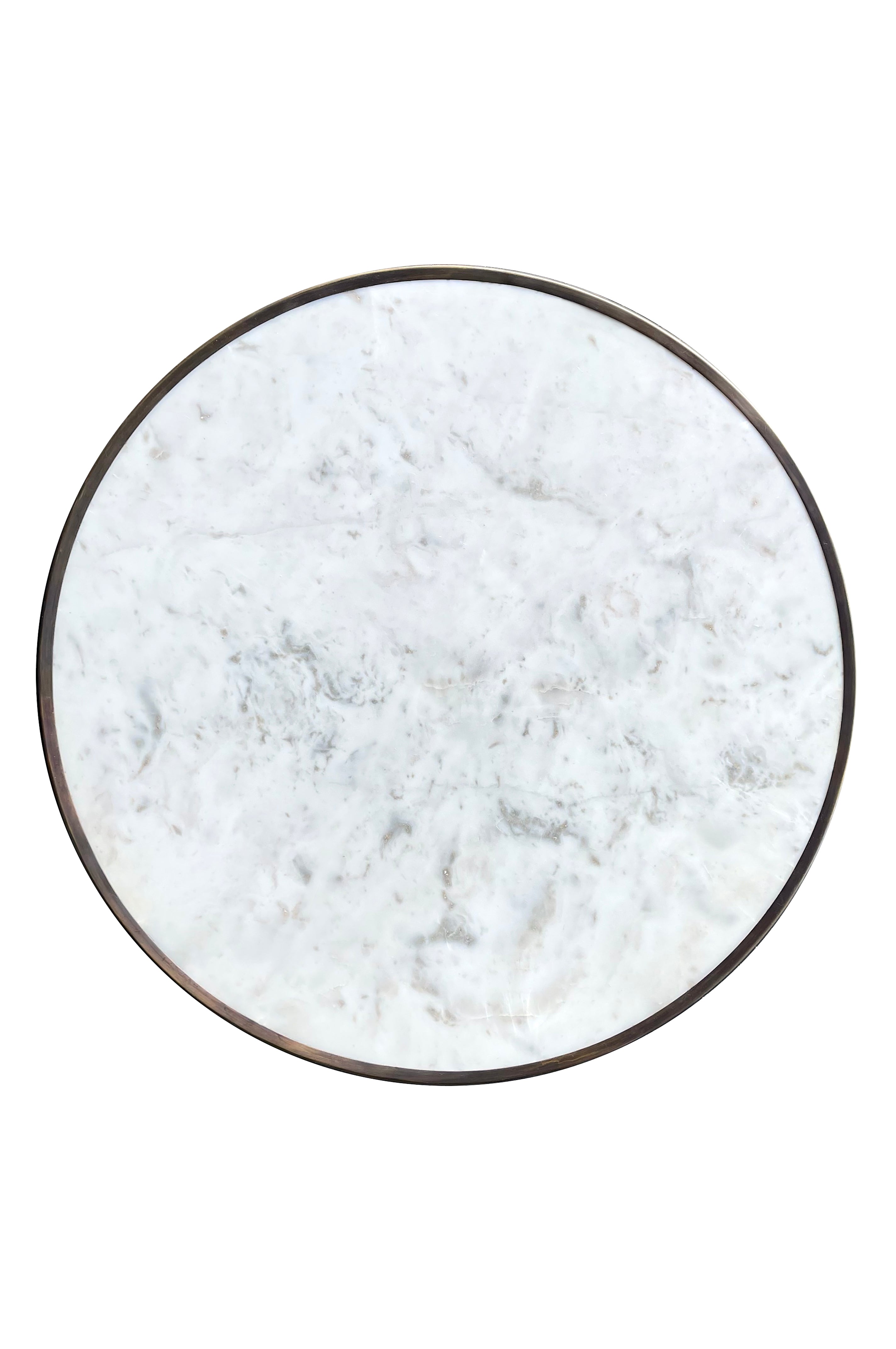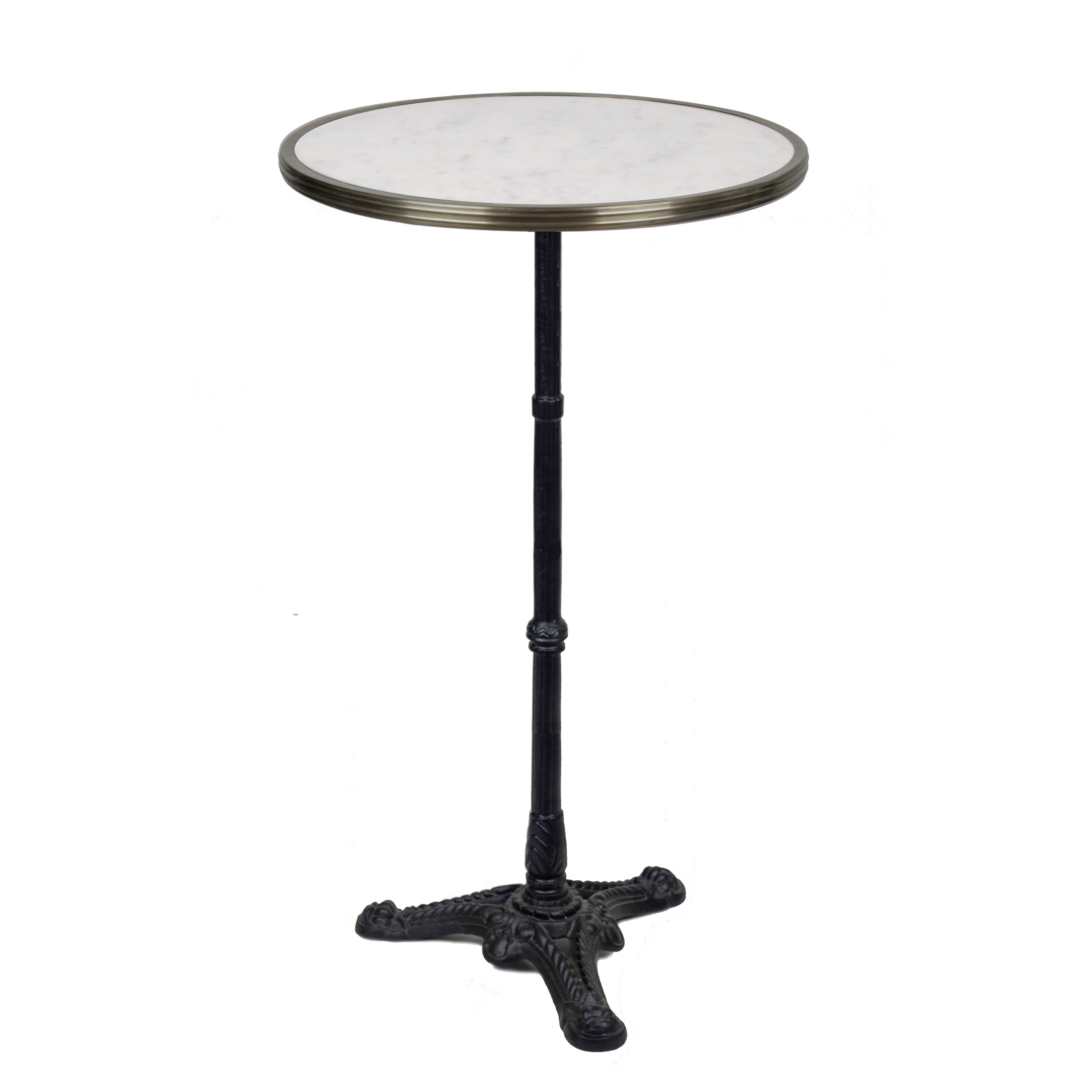 These traditional tables feature a solid marble top inside a seamless brass banded rim and a sturdy, solid cast-iron base. The table's antiqued banded rim is made of brass and encircles the marble, protecting it from chipping and daily wear and tear. The base has been powder-coated and features the same detail from an early 20th-century French bistro table. We have replicated every part of the fabrication process, including how the marble is affixed to the table.