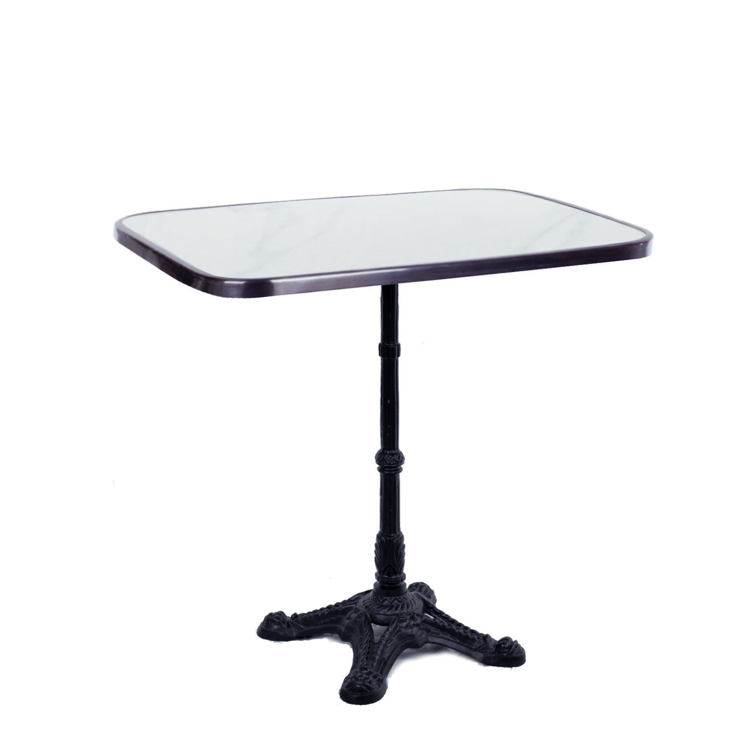 This rectangular French Bistro table is ideal for hospitality use. The ceramic top lends itself to daily restaurant and bar use. The compressed stone is more durable than marble, making it less likely to break or crack. It is also scratch-resistant and virtually stain-proof. The table is a variation of tables used in cafés and restaurants in late 19th—and early 20th-century France.