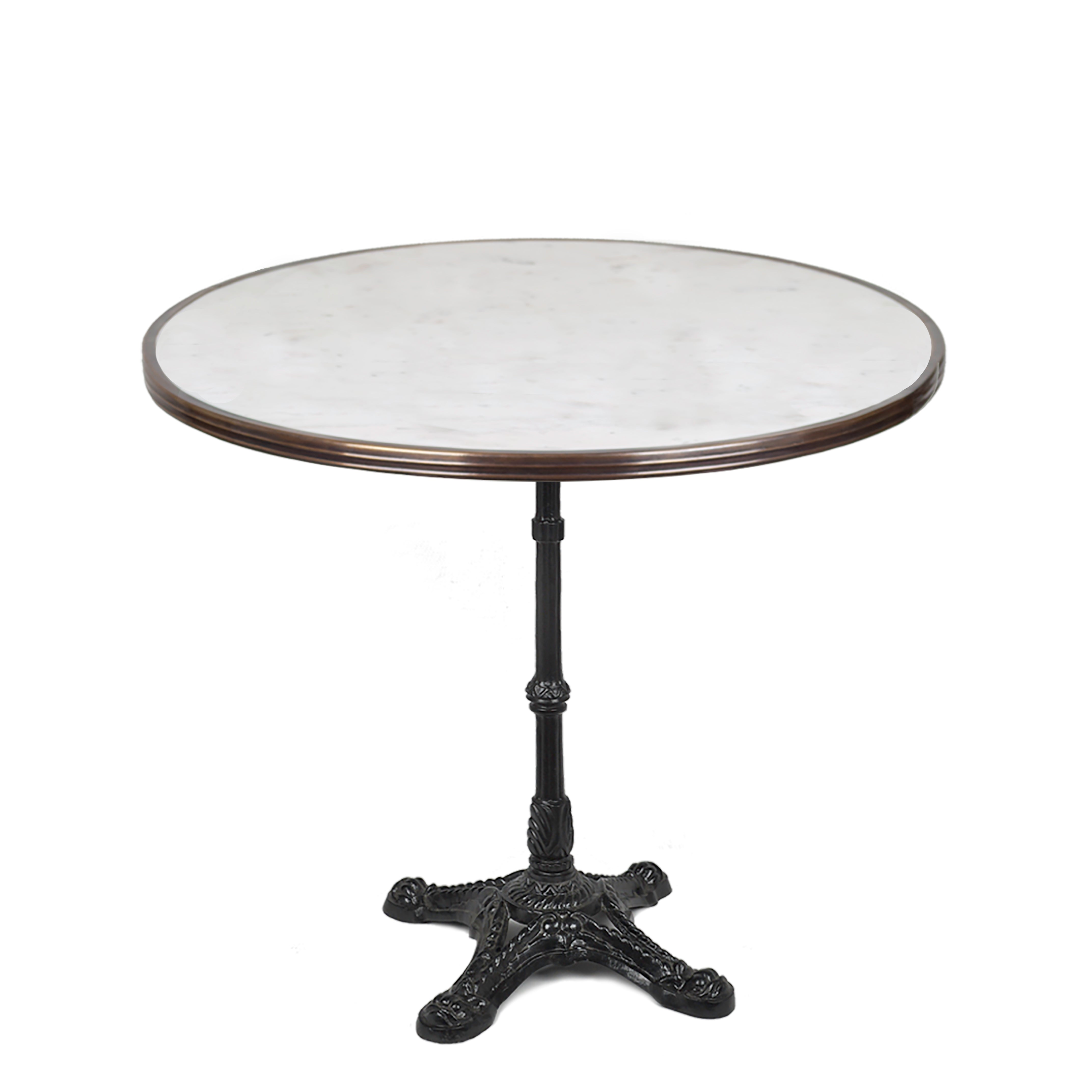 Their solid marble top and cast iron base are constructed to the same standards as the originals, including the hoop, which encircles the marble for protection and features an antiqued, seamless brass band. The powder-coated base features the same detail, also taken from an early 20th-century French bistro table. All construction has been faithfully reproduced, including how the marble is fixed to the table. Heavy-duty steel bars are used under the table top to hold the marble to the base.