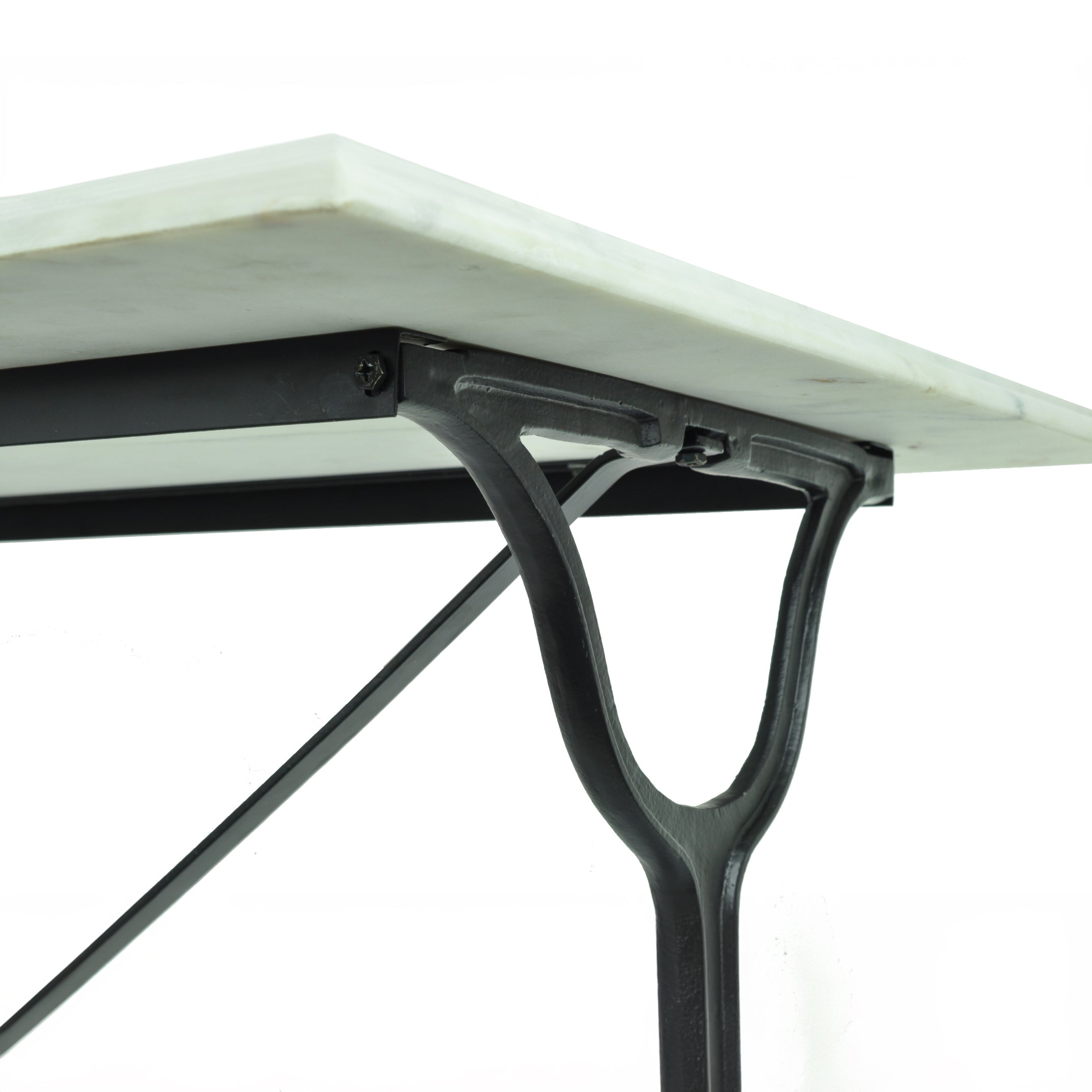 This is a heavy, solid marble table. The rim of the marble top features a cove bevel design. The heavy-duty cast iron side legs and steel braces are coated with painted enamel and are attached to the underside of the table by a series of screws embedded into the marble. This technique replicates the original Belle Epoque antique tables.