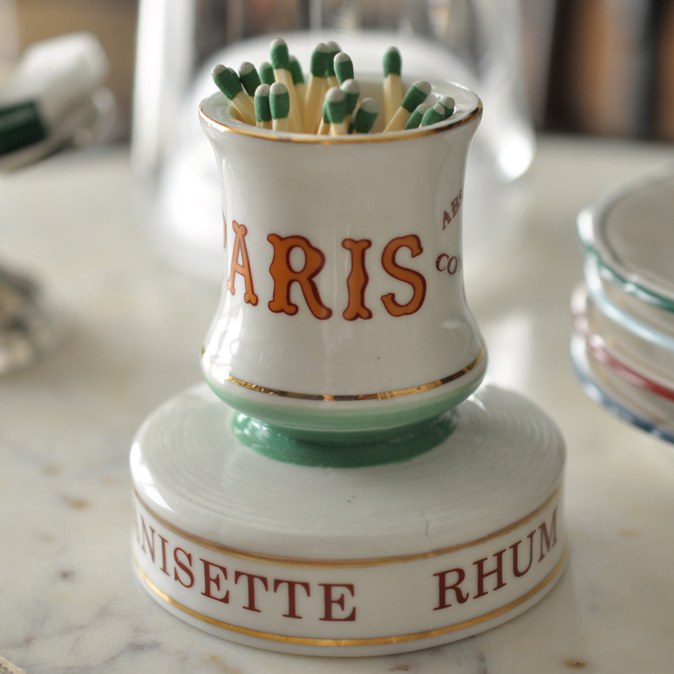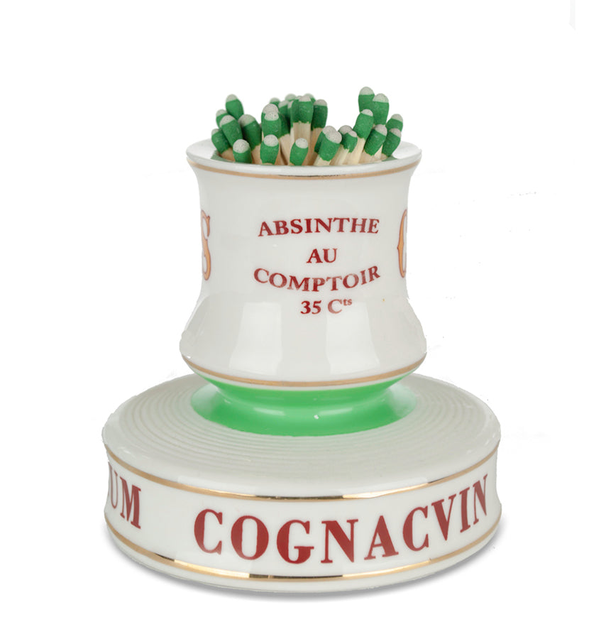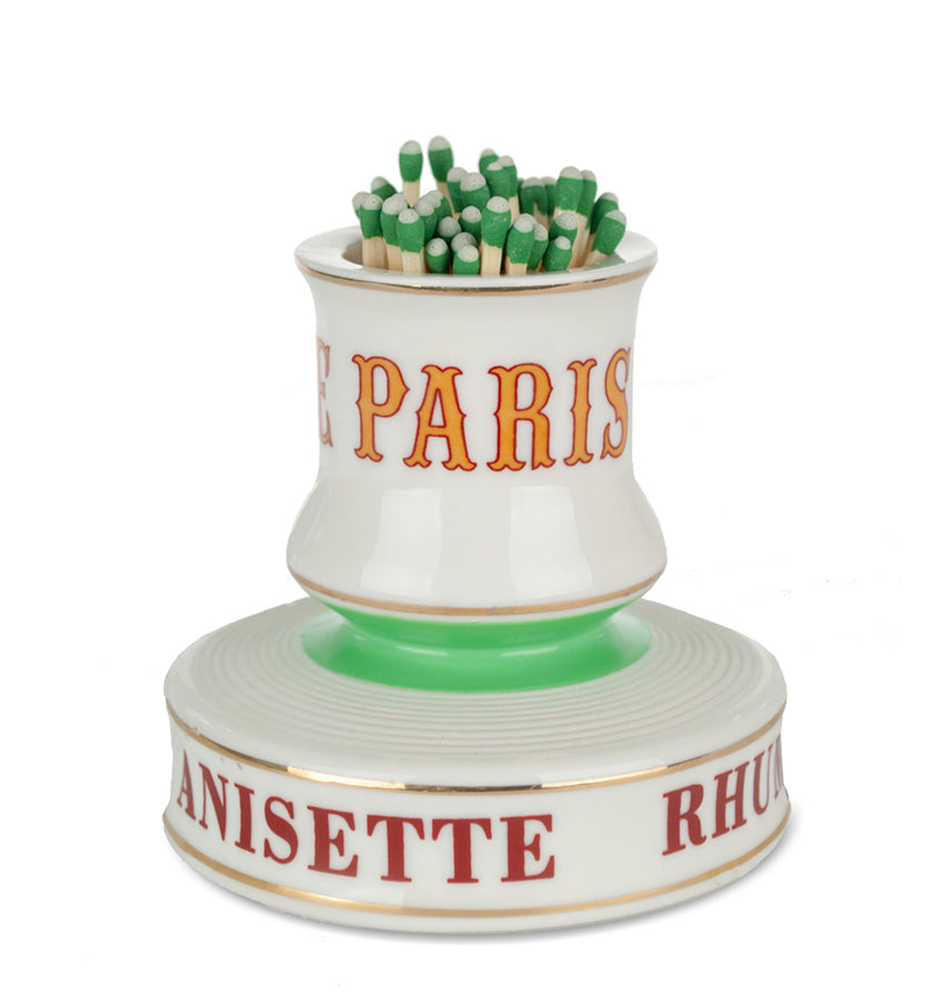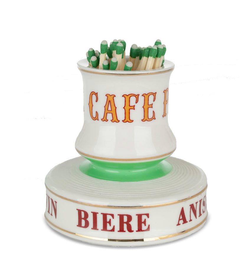 This unique match strike is a reproduction of those found throughout late 19th and early 20th century France. It was common to see a match striker sitting on a bistro table or bar at that time. The strikers are comprised of two separate parts. First, the top cylindrical container is used to hold matches. And the other, the ribbed surface on its side (or base), is used to strike and ignite the match. In the past, the pieces also served as advertisements. Many companies used items like these to promote their wares, which were usually provided to the bar for free.