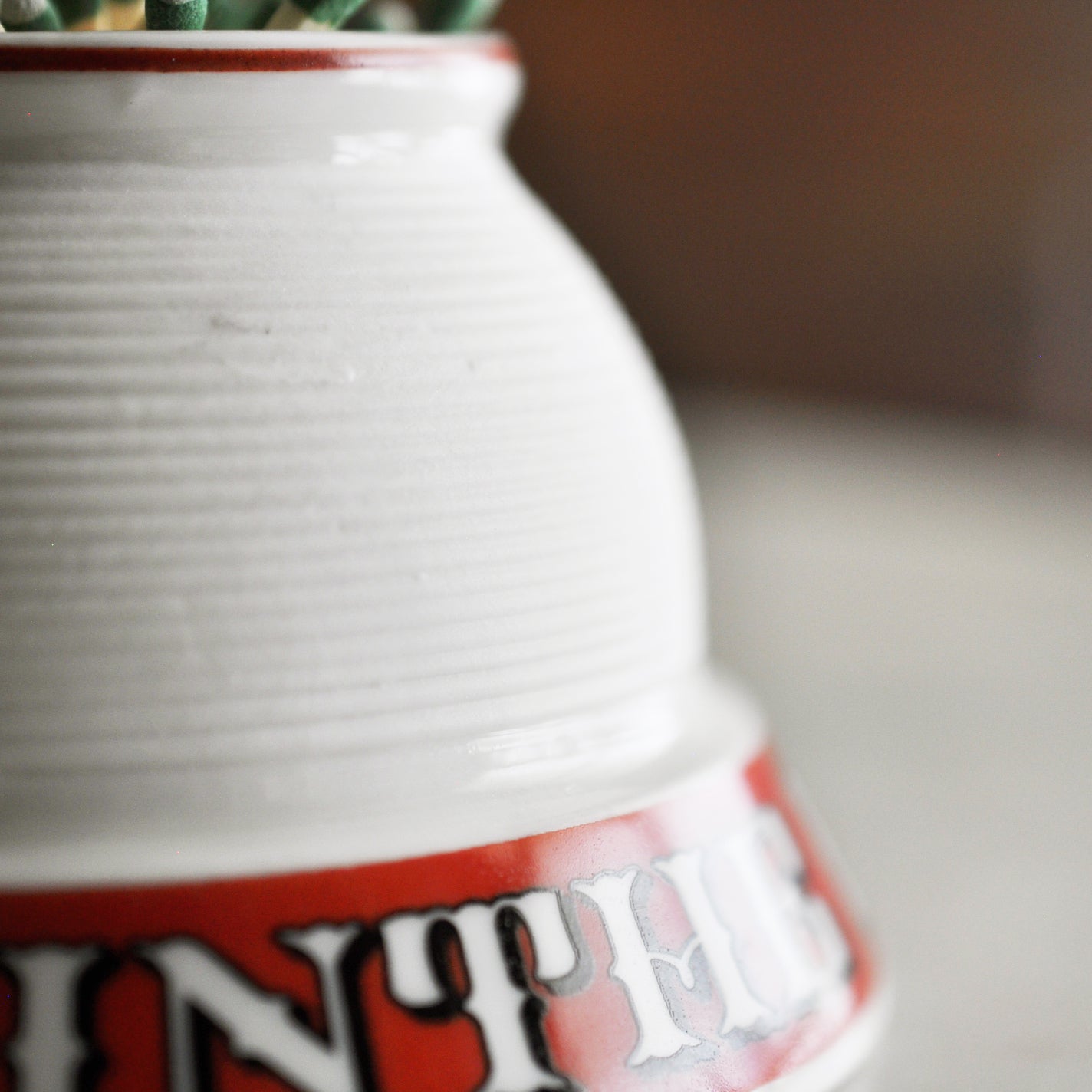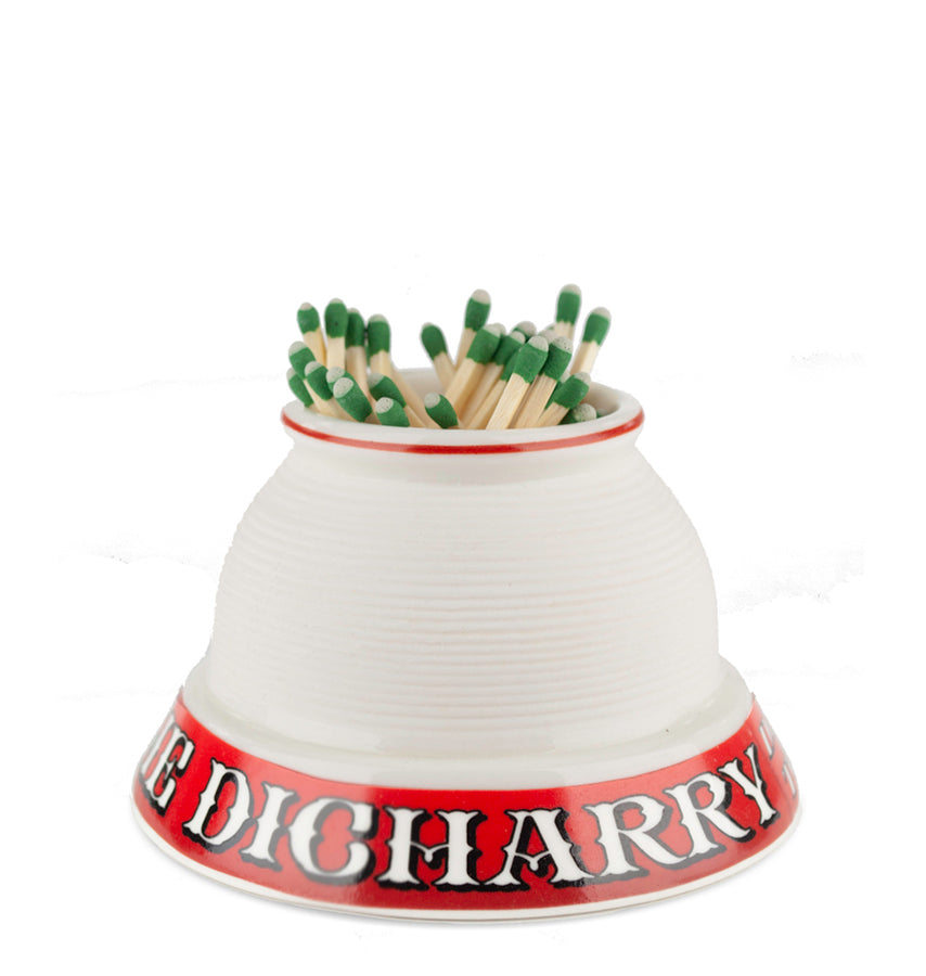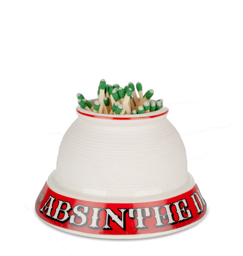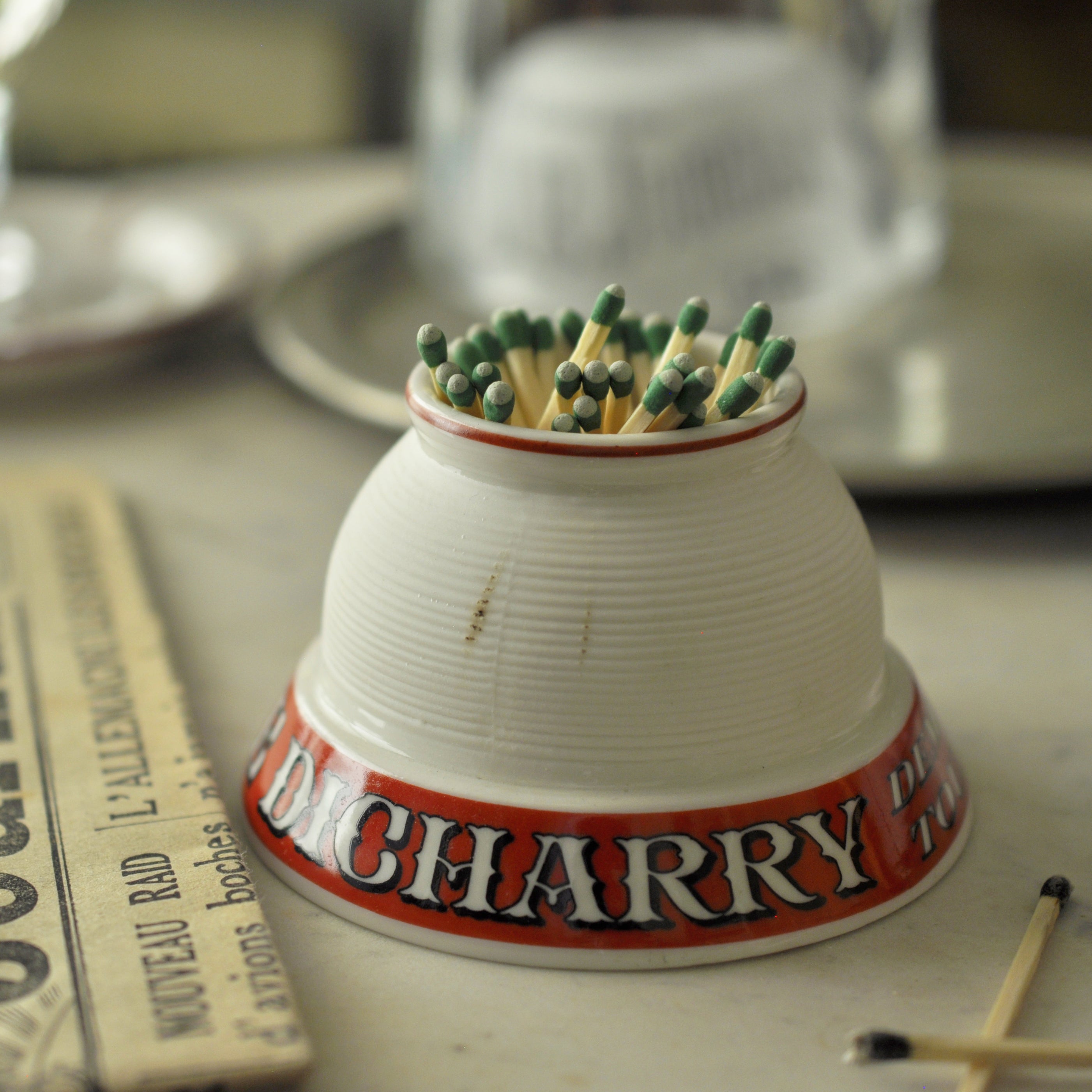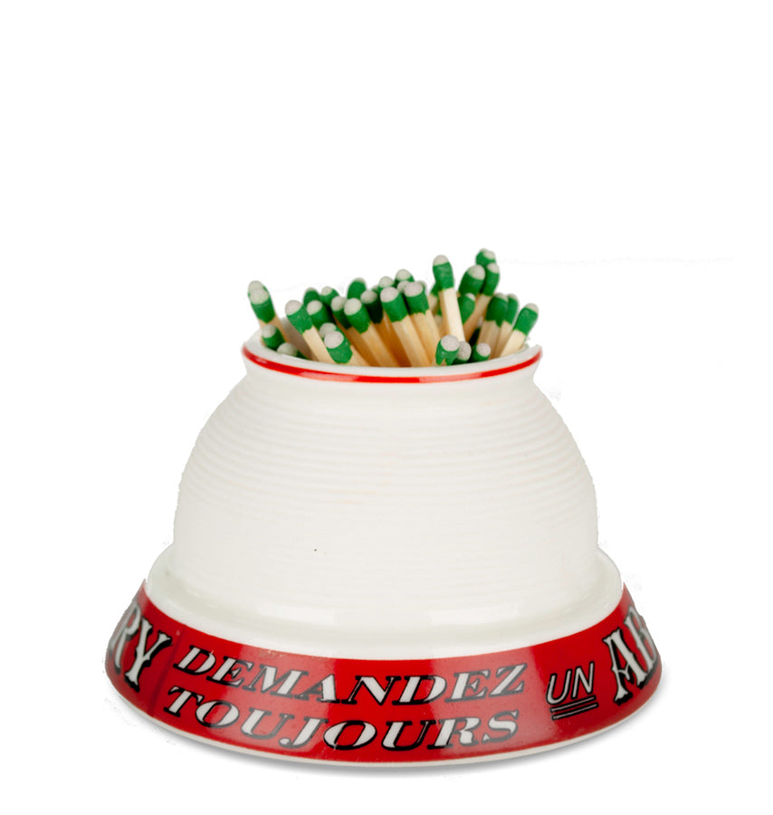 This unique match strike (or pyrogène in French) is a reproduction of those found throughout late 19th and early 20th century France. It was common to see a match striker sitting on a bistro table or bar at that time. The strikers are comprised of two separate parts. First, the top cylindrical container is used to hold matches. And the other, the ribbed surface on its side (or base), is used to strike and ignite the match. In the past, the pieces also served as advertisements. Many companies used items like these to promote their wares, which were usually provided to the bars for free.