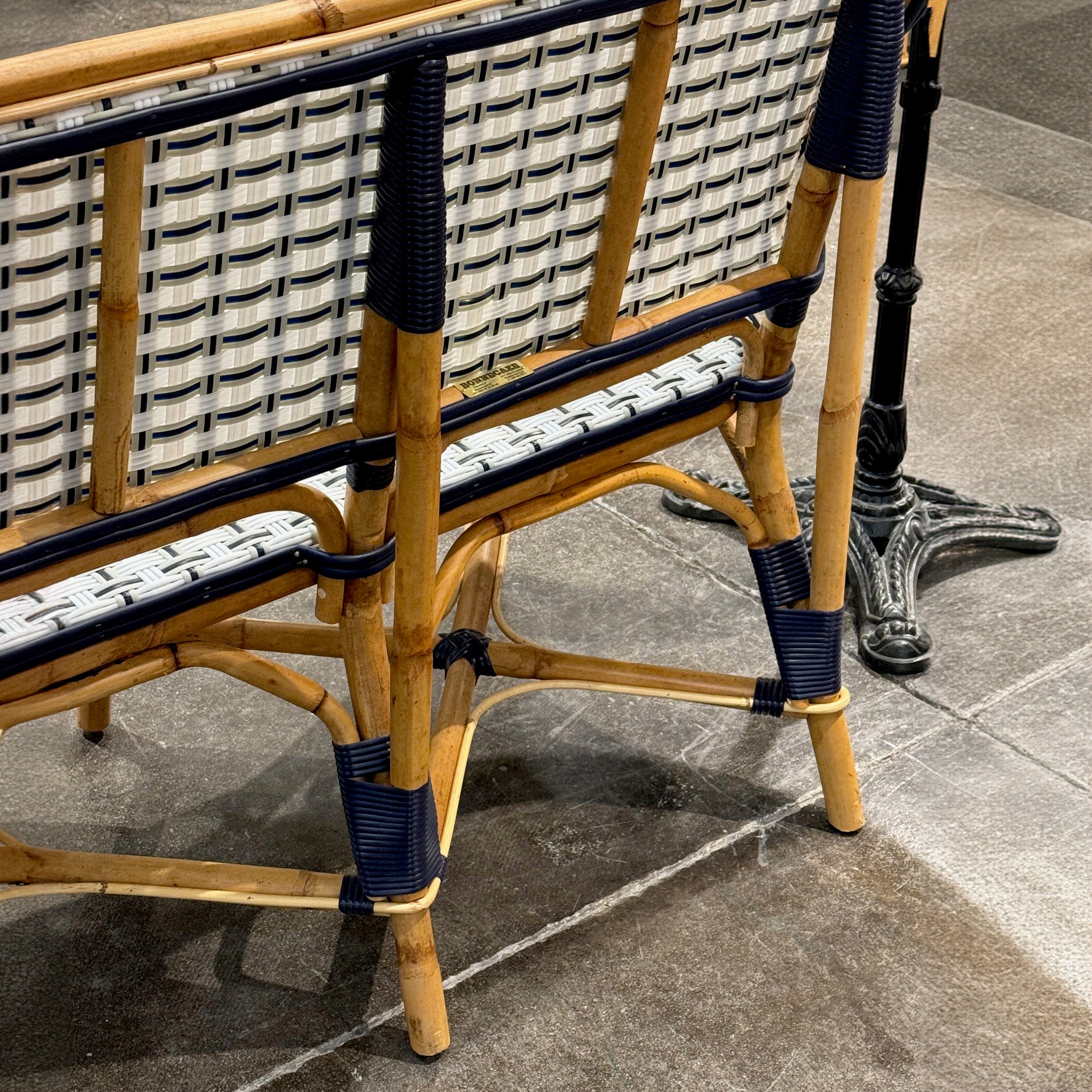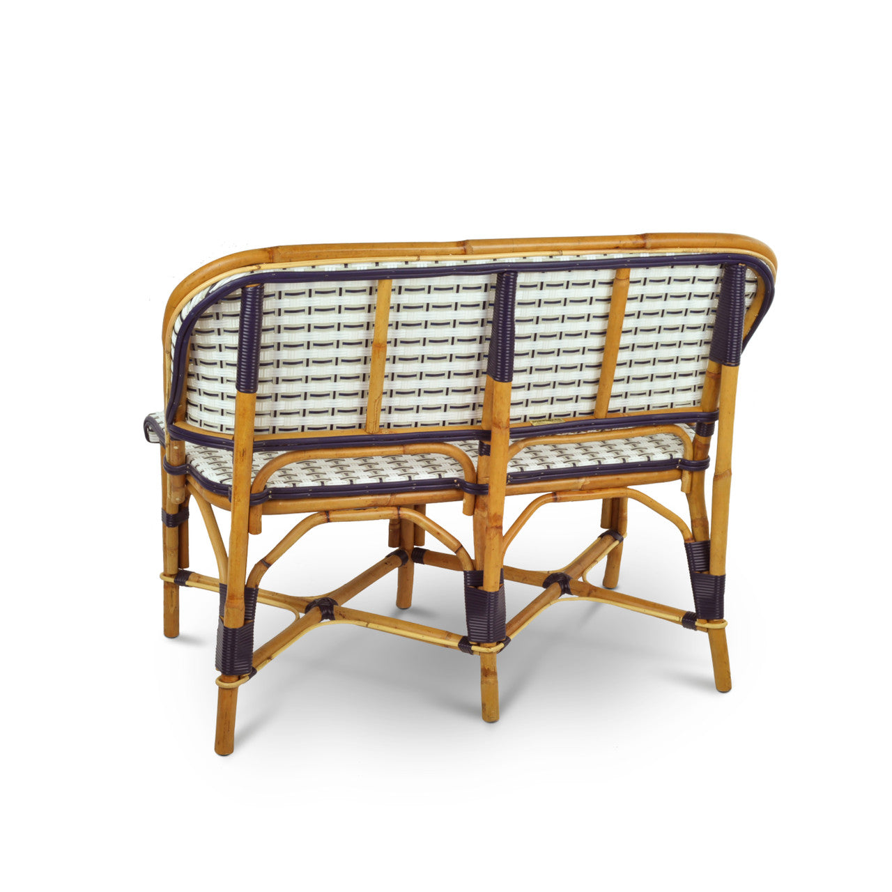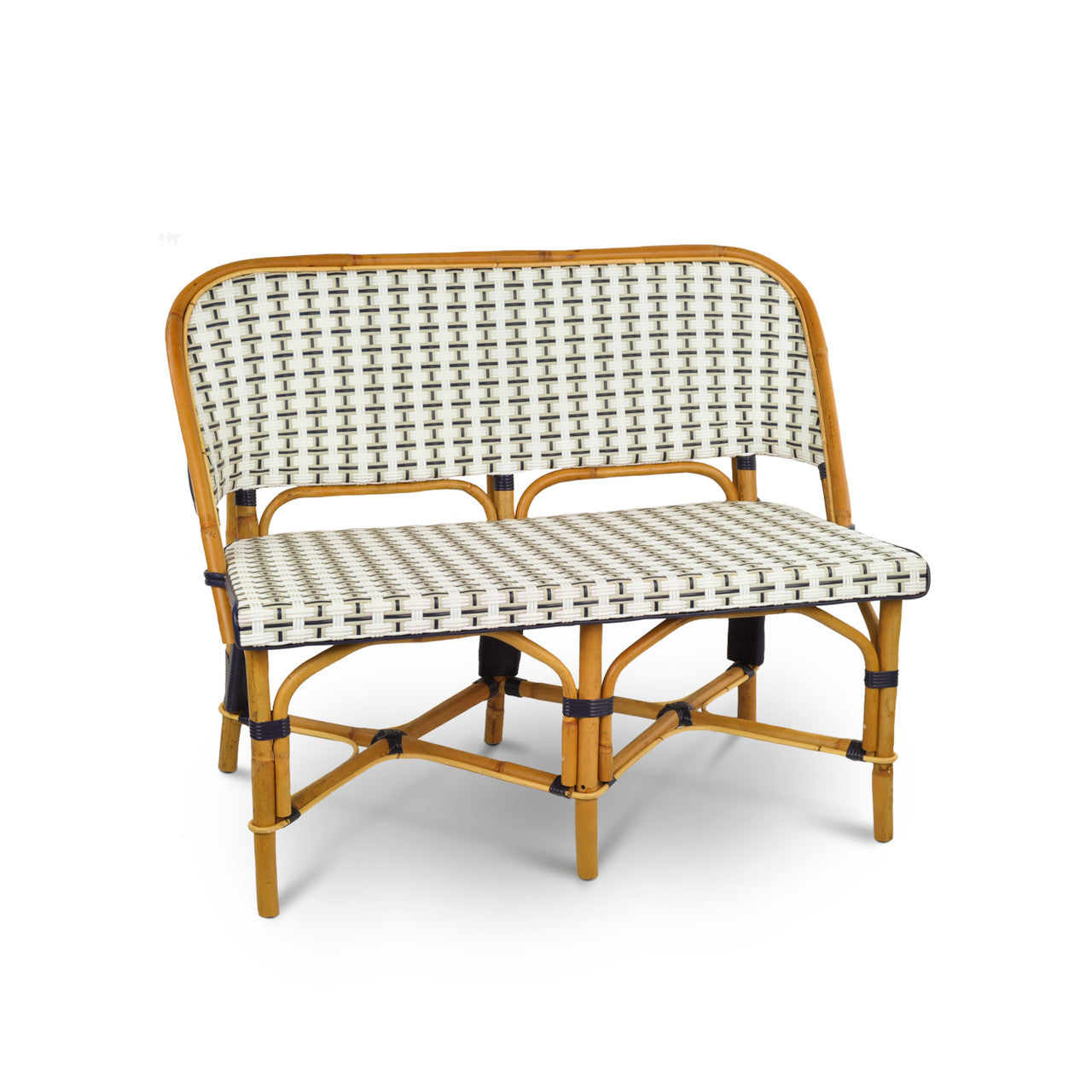 Valence French Bistro Rattan Banquette/Bench, 2-Seat - Vertical Pattern - White/Silver/Navy Blue