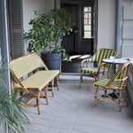 Like our rattan furniture, our tables are meant to be used. They easily hold up to daily restaurant life. Their solid marble top and cast iron base are constructed to the same standards as the originals, including the band, which encircles the marble for protection and features an antiqued, seamless brass hoop. The powder-coated base features the same detail, also taken from an early 20th-century French bistro table. All construction has been faithfully reproduced, including how the marble is fixed to the table. Heavy-duty steel bars are used under the table top to hold the marble to the base.