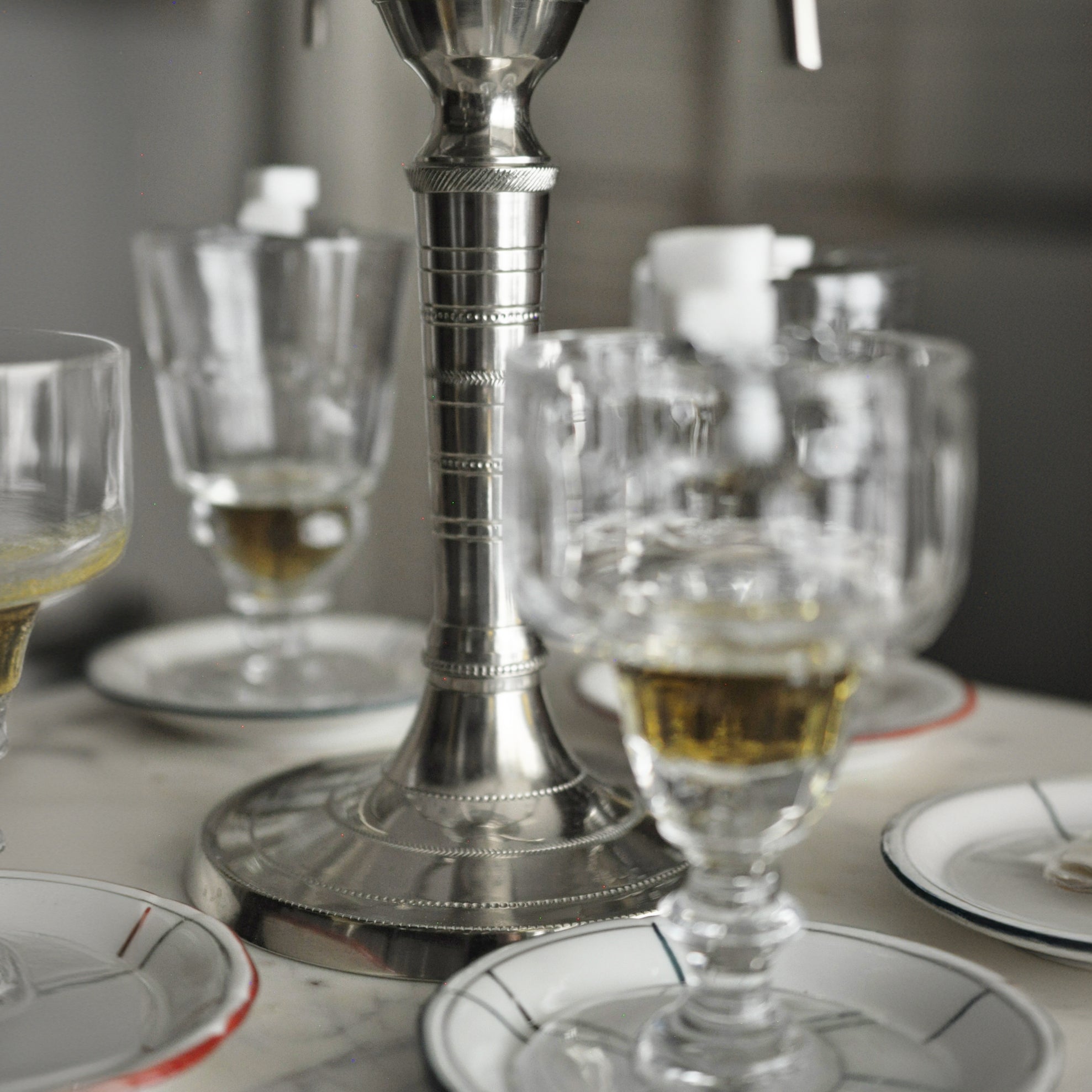 Absinthe fountains were mostly used in high-end bars because of their expensive price tag. They were brought to the table, where the customer would prepare the absinthe himself. Absinthe fountains were (and still are) the preferred way to prepare absinthe, as one can perfectly control the rate of water. But unfortunately due to accidents, very few fountains have survived intact with its original glass bowl.
