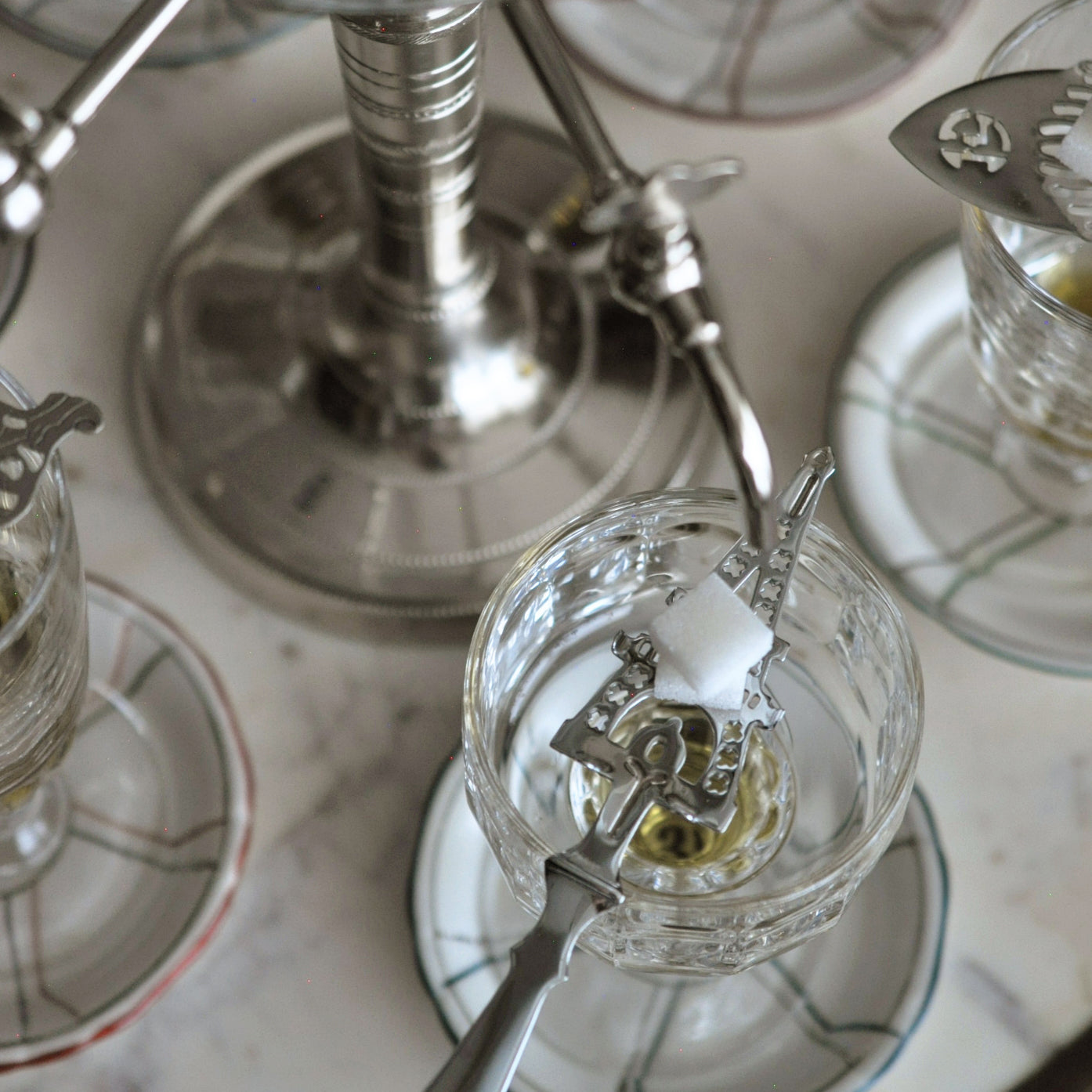 The combination also turns milky white as the water mixes with the anise. Once the sugar has dissolved from the spoon, the absinthe can be sampled, and the strength and sweetness can be adjusted by adding more water or sugar to taste. The mix ratio depends on one’s liking - usually 1-part absinthe to 3 to 5 parts water. At the turn of the last century, the French had a big sweet tooth, so they typically used a large amount of sugar. Refresh water before each use. California Prop 65 compliant when properly used.