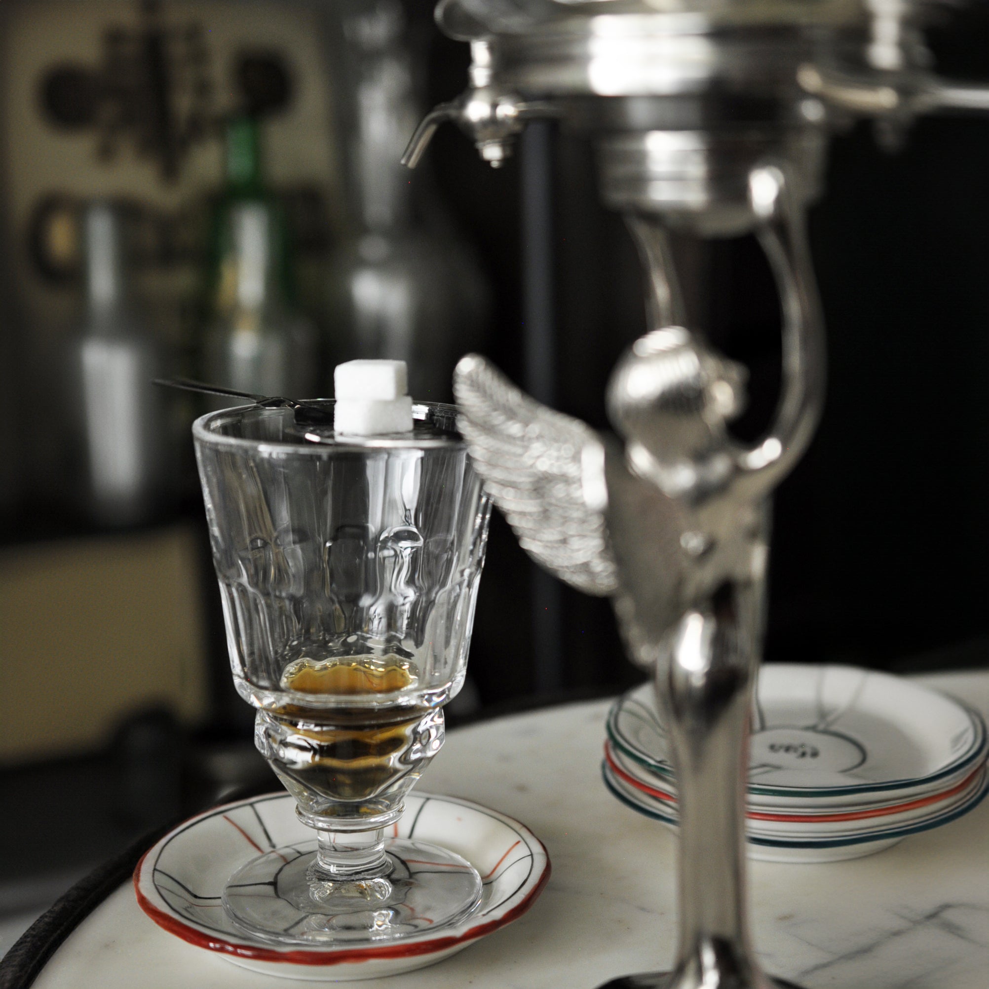 from a fountain or carafe onto the sugar. The water dissolves the sugar, and the cold, sugary mixture then falls from the spoon into the glass of absinthe, releasing oils and perfuming the air with fennel, grand wormwood, and anise.