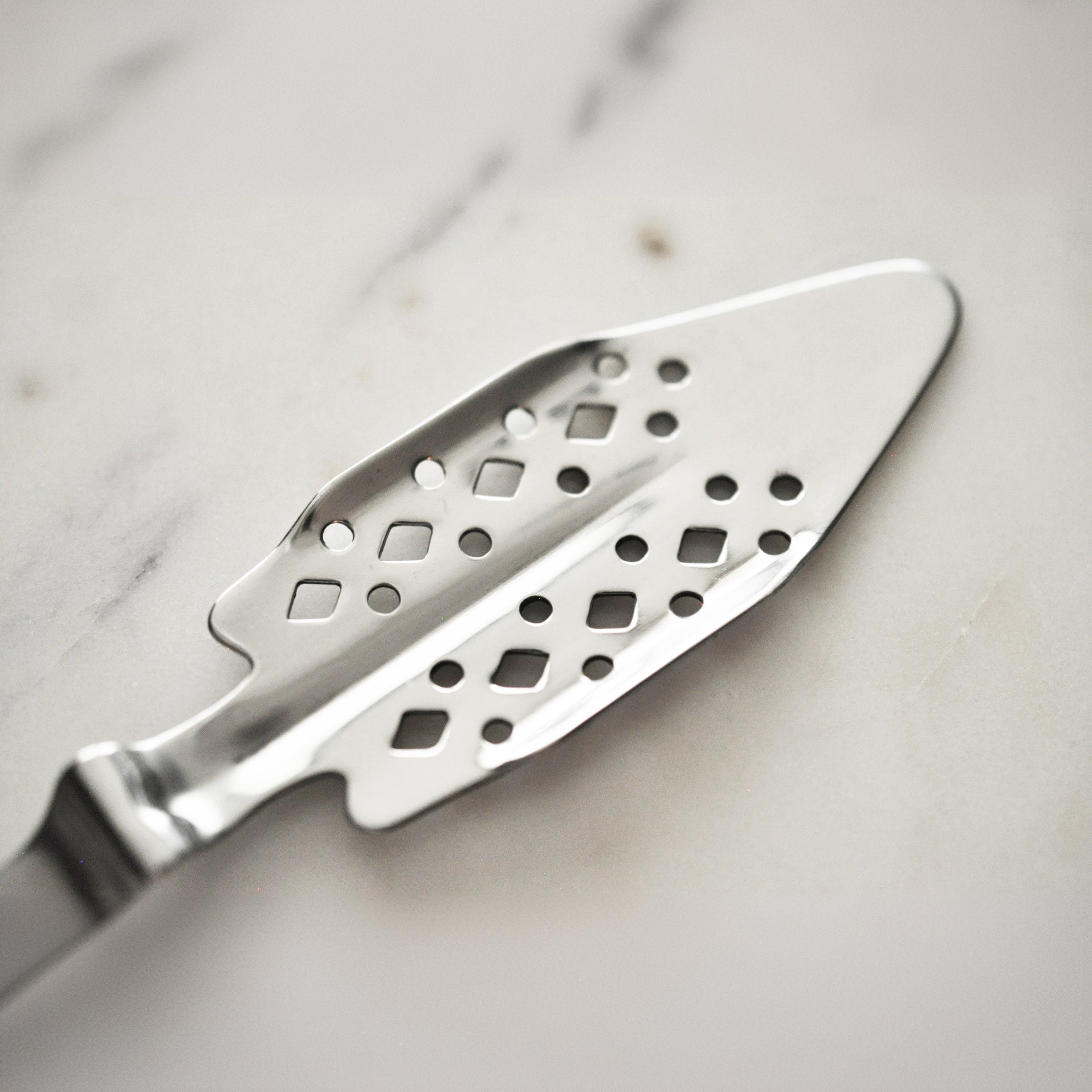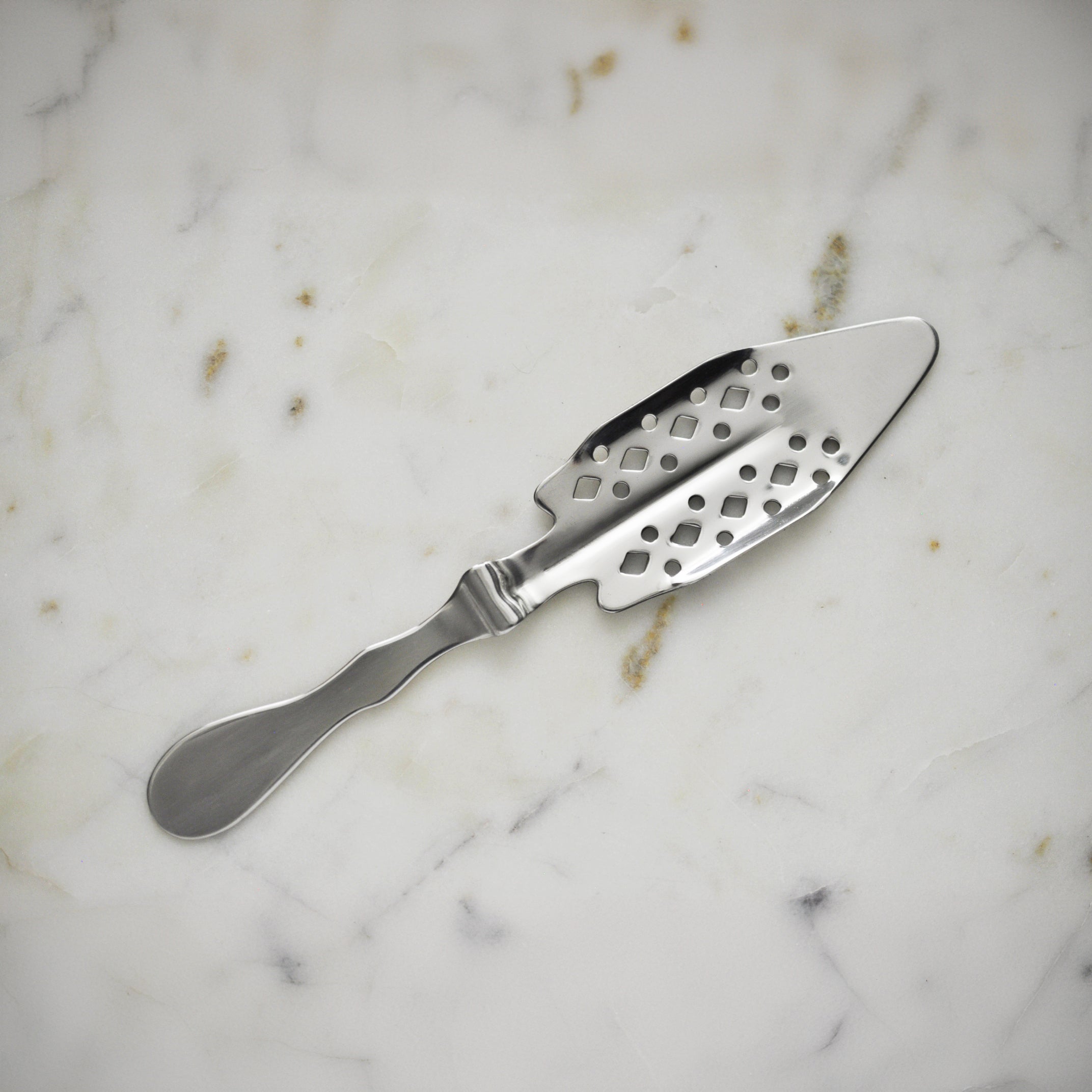 This classic absinthe spoon was one of France's most popular and most commonly found spoons in cafes and bars during the pre-ban absinthe era (before 1915). The spoon's grille contains 8 squares and 18 small circle cut-outs. It is an exact reproduction of a late 19th-century absinthe spoon.