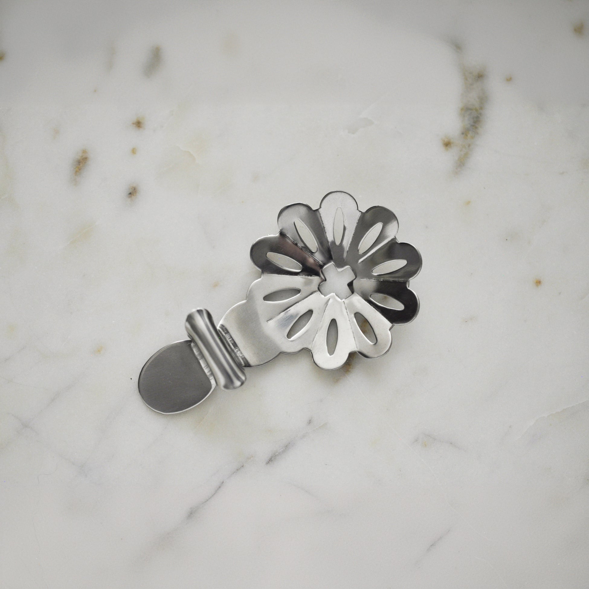 This unique round grille clips onto the side of your absinthe glass to hold your sugar cube when preparing an absinthe. The piece will work on virtually any glass and can be adjusted to fit even the thinnest of glasses. The Swiss Cross (prominent in Switzerland's national flag) is featured in the middle of the grille. It is an exact reproduction of a late 19th or early 20th century absinthe spoon.