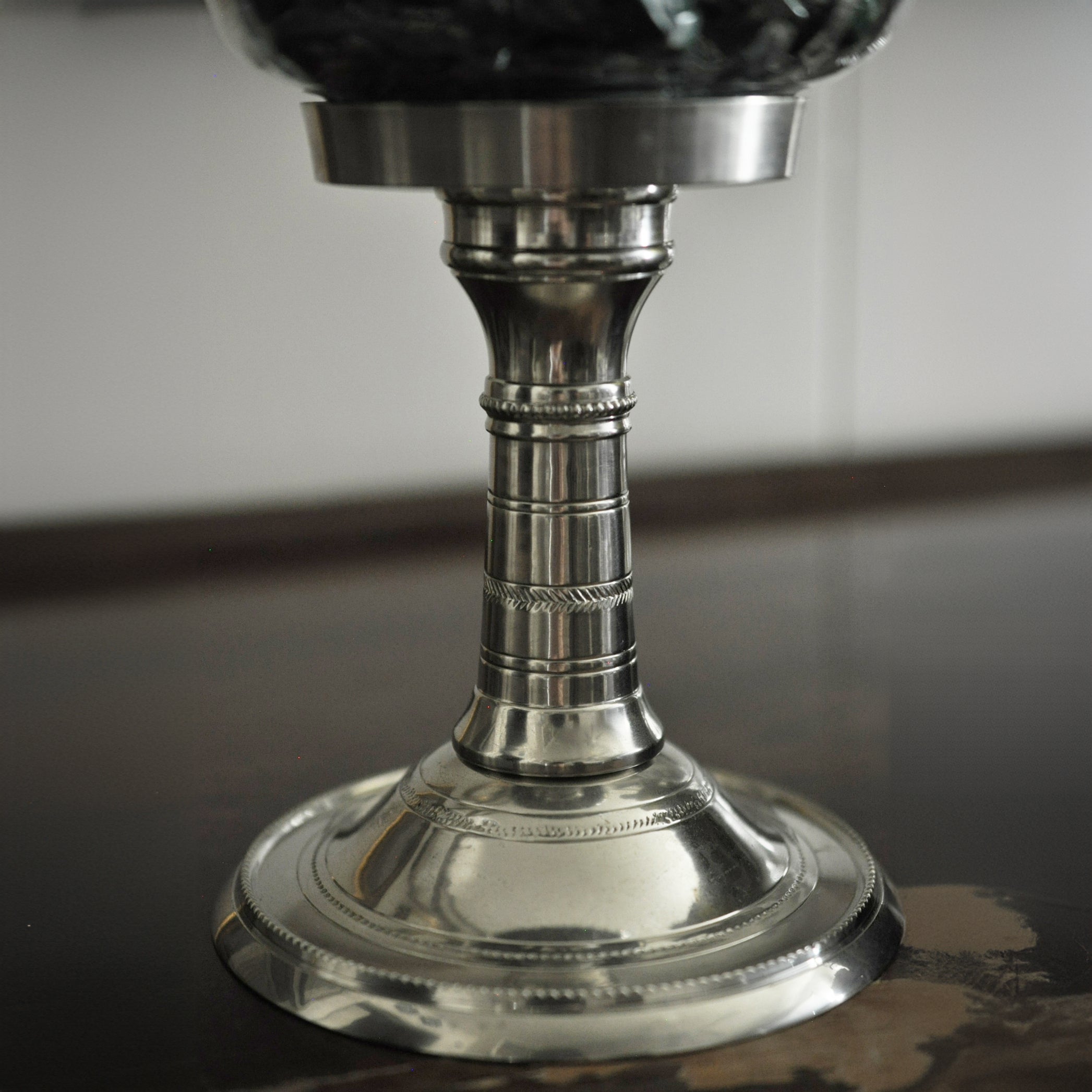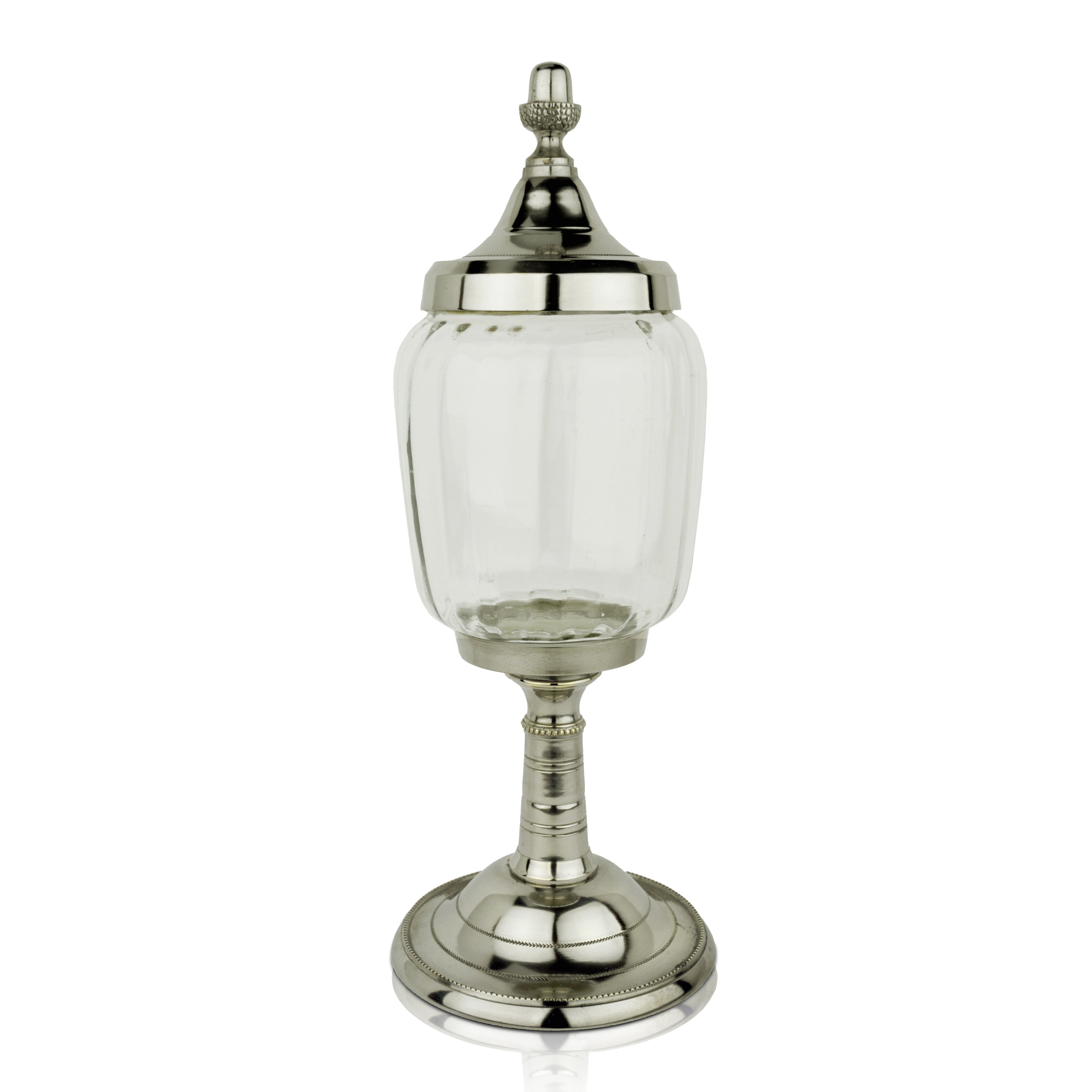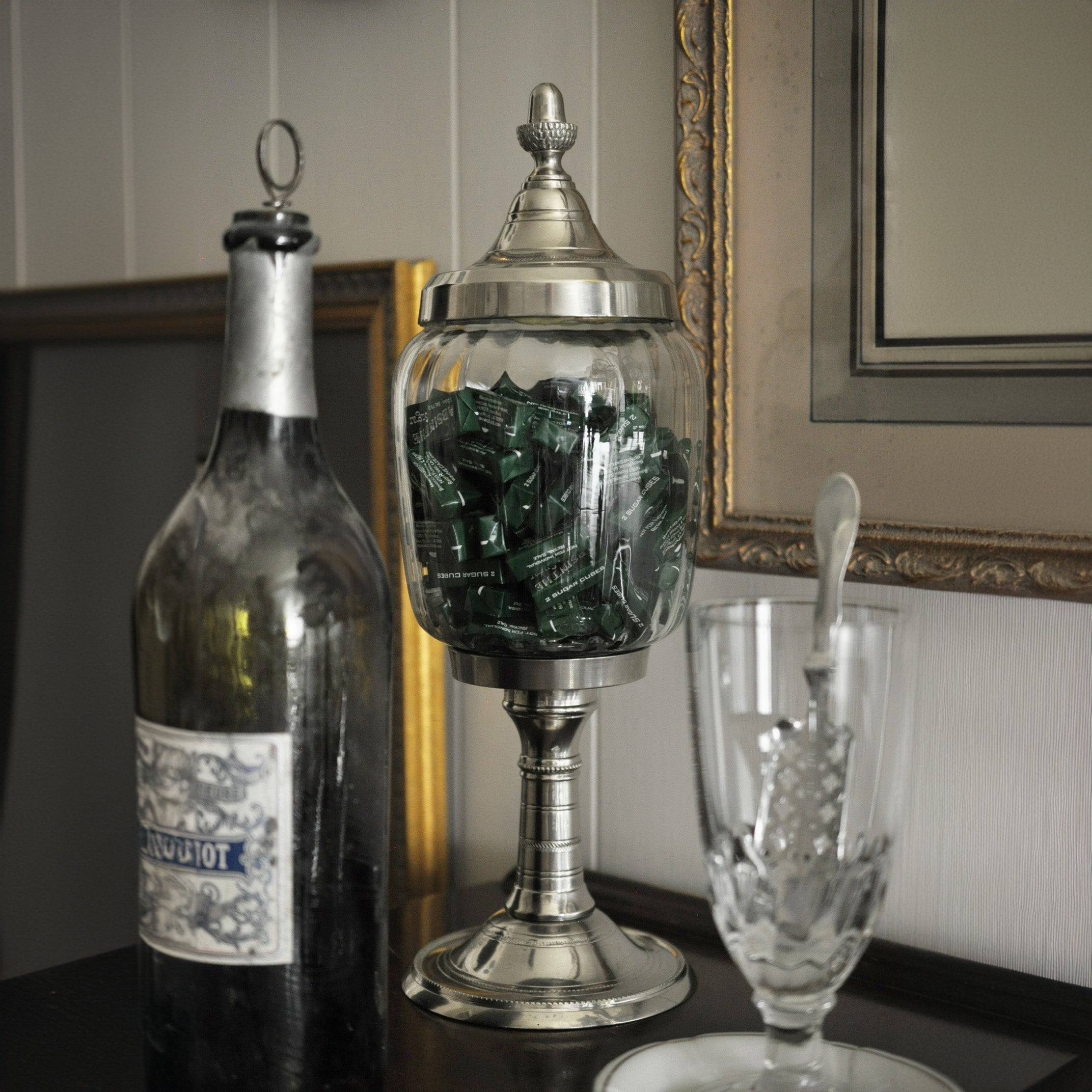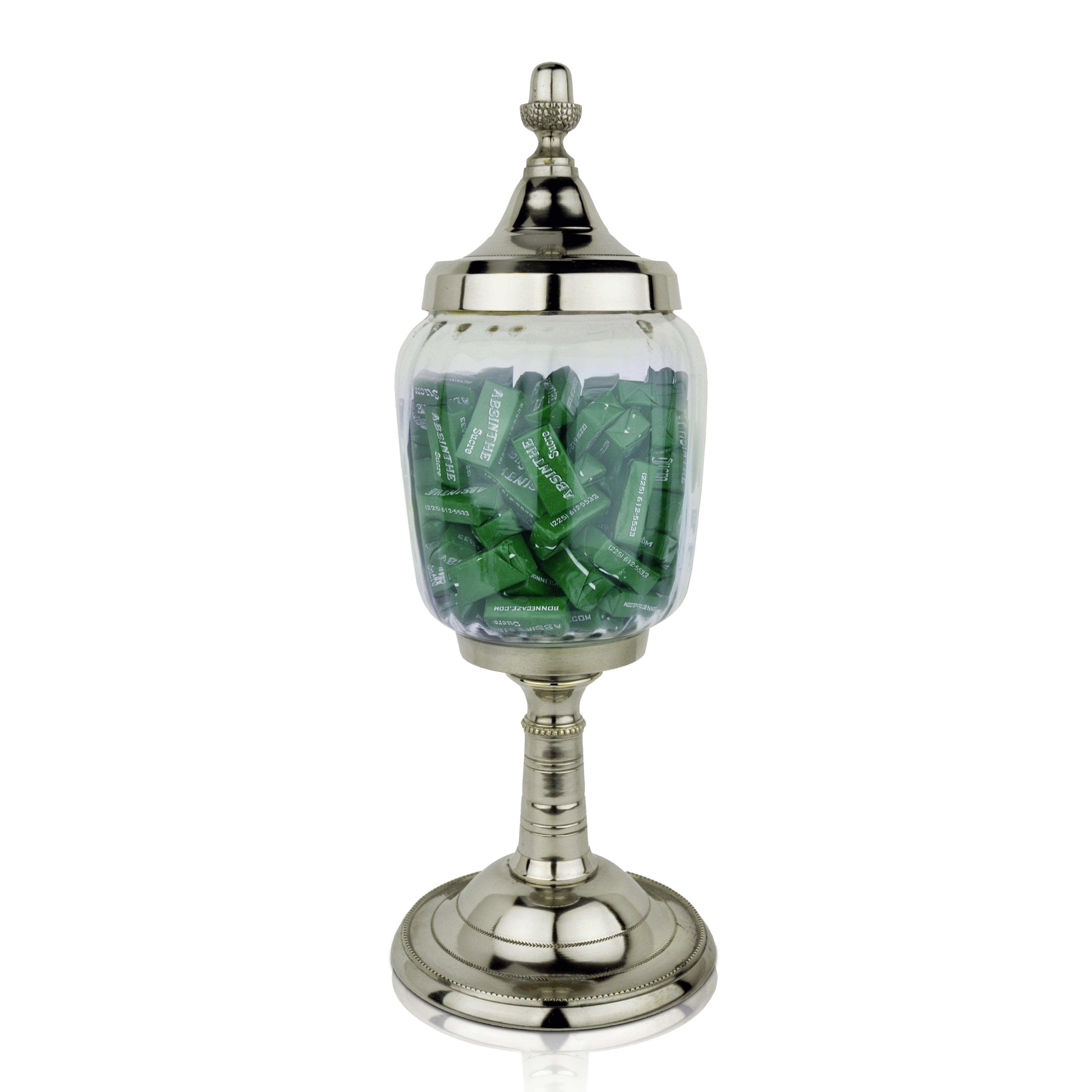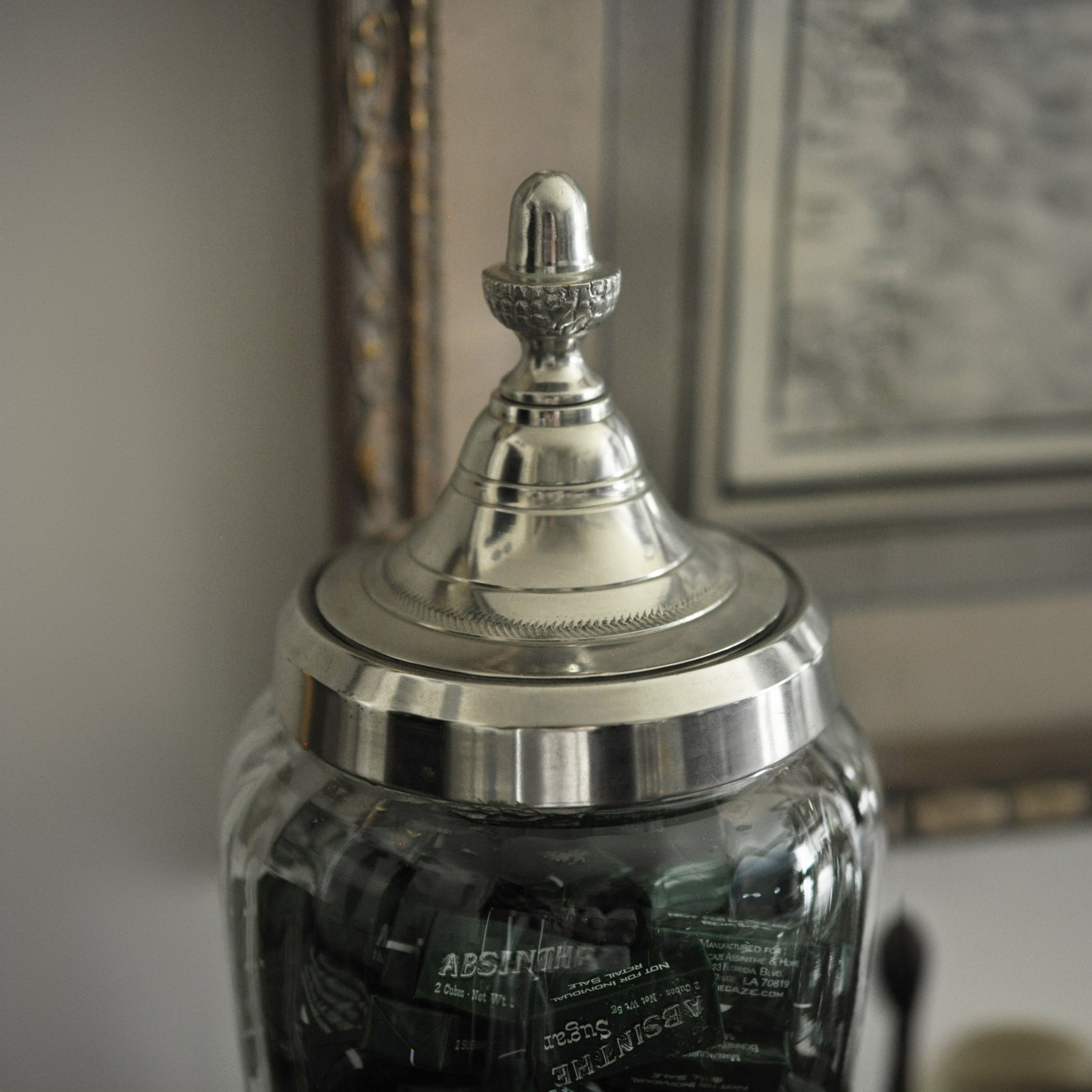 This is an exact reproduction of an antique sugar cube holder used to hold sugar in preparing a traditional French or Swiss absinthe. Every detail has been meticulously replicated from the original, from the waves in the mouth-blown glass to the beading on the base and stem. The lid is topped with an acorn, associated with good luck and prosperity.